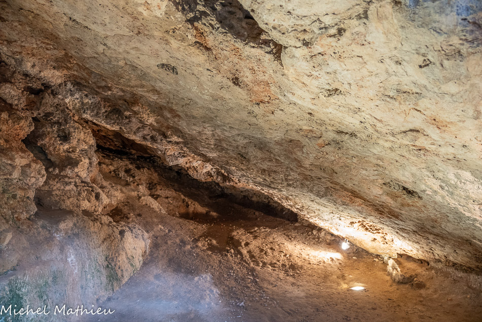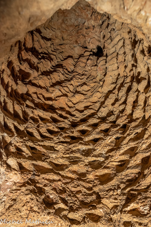 On peut observer que des troncs de palmiers, dont le bois a disparu, ont laissé leurs empreintes en forme de cônes imprimeé dans l’épaisseur de la dalle de pierre, au niveau du plafond de la cavité et sur les parois. La plus grande mesure 1 m de diamètre et 2 m de hauteur. On dénombre, au total, 15 empreintes de taille différentes mais seules quelques-unes sont bien marquées. Les traces des troncs de palmiers étant différentes entre elles, nous pouvons supposer que des palmiers de diverses espèces peuplaient notre région au tertiaire.
