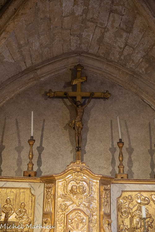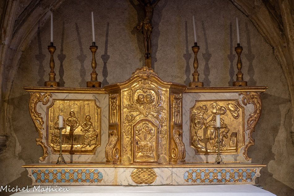 Ancien maître-autel, en bois sculpté et doré (XVIIe siècle). Bien que voûtée d’ogives, elle semble postérieure aux chapelles précédentes : les culots sont en effet d’une facture radicalement différente.