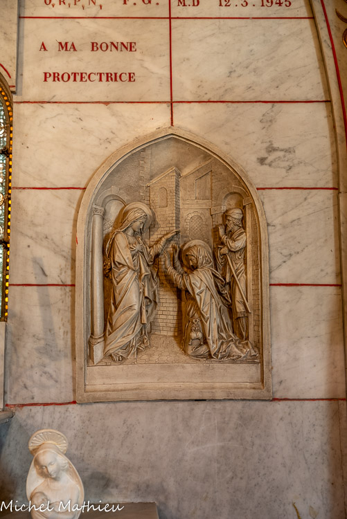Autel, vitraux et parements en marbre, avec l’A et le M entrelacés d’Ave Maria (XIXe siècle).