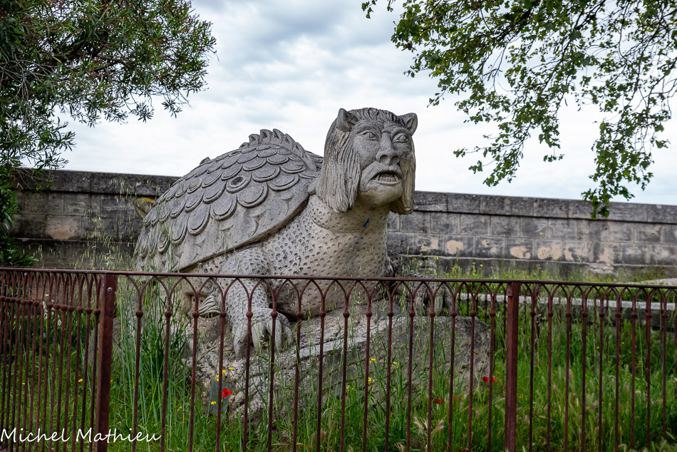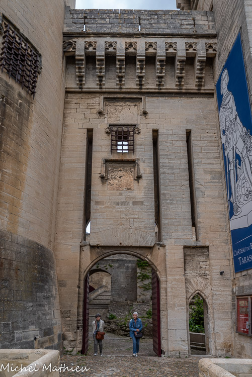 Sur le côté du château, la Tarasque. C'était une bête qui était censée hanter les marécages près de Tarascon, détruisant tout sur son passage et terrorisant la population. Ce monstre peut avoir de multiples formes, mais la plus fréquemment illustrée est pourvue de six courtes pattes comme celles d'un ours, d'un poitrail comme celui d'un bœuf, d'une carapace de tortue mais épineuse, et d'une queue écailleuse. Sa tête pouvait ressembler à celle d'un lion aux oreilles de cheval avec un visage de vieil homme. Sainte Marthe la dompte, lui passe une laisse autour du cou, mais rendue inoffensive elle est tuée et mise en pièce par les habitants.