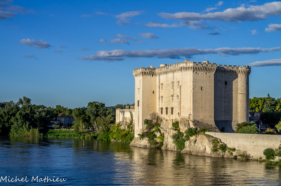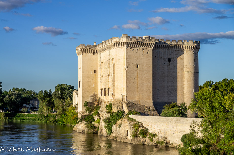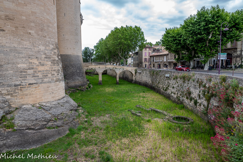 Bas des tours rondes : la Tour des Chapelles et la Tour de l'Horloge. Le château est entouré de larges douves, aujourd'hui séparées du Rhône par un mur, mais initialement en eau.