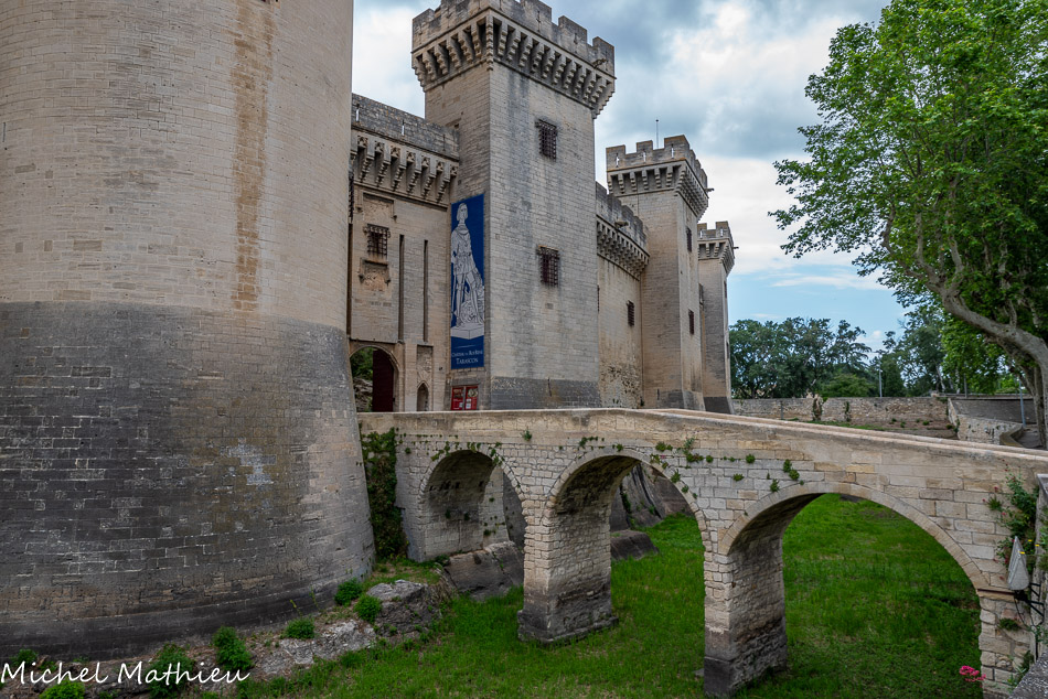 Sur le côté du château, la Tarasque. Au fond, la Collégiale Royale Sainte Marthe.