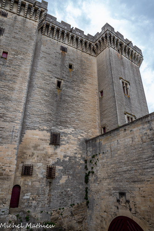 Cour d'entrée. A gauche, le donjon, à droite, la Tour de l'Artillerie, derrière le mur donnant sur le Rhône. Par elle, on accède aux étages. C'est une grosse tour carrée, dont la fonction est de défendre la porte donnant sur le Rhône. En bas, la porte du Rhône.
