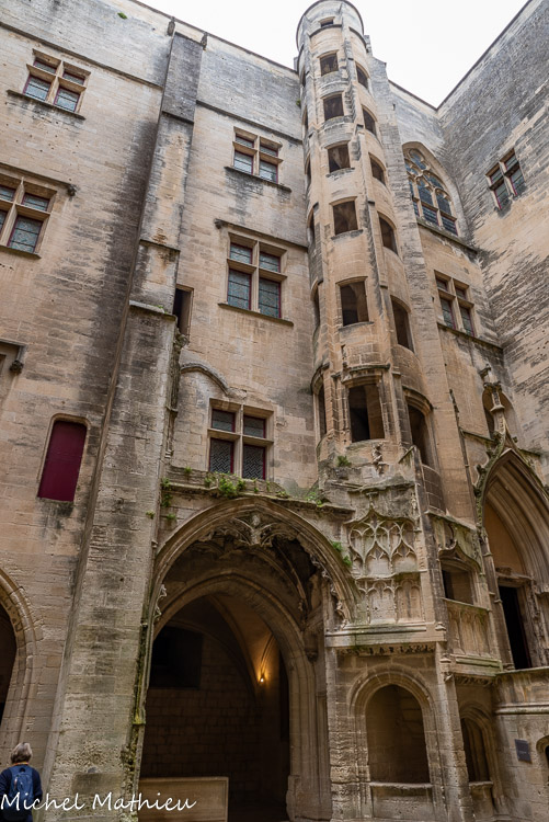 La cour d'honneur. Le plus remarquable est l'escalier à vis extérieur, tout à fait Renaissance, qui prend naissance au-dessus du puits. Circulaire, il est renforcé de mini contreforts. De larges fenêtres rectangulaires l'éclairent. Très joli, il est antérieur à celui de Blois, qui lui ressemble. A droite, au dernier étage, une fenêtre en gothique flamboyant éclaire la chapelle supérieure.