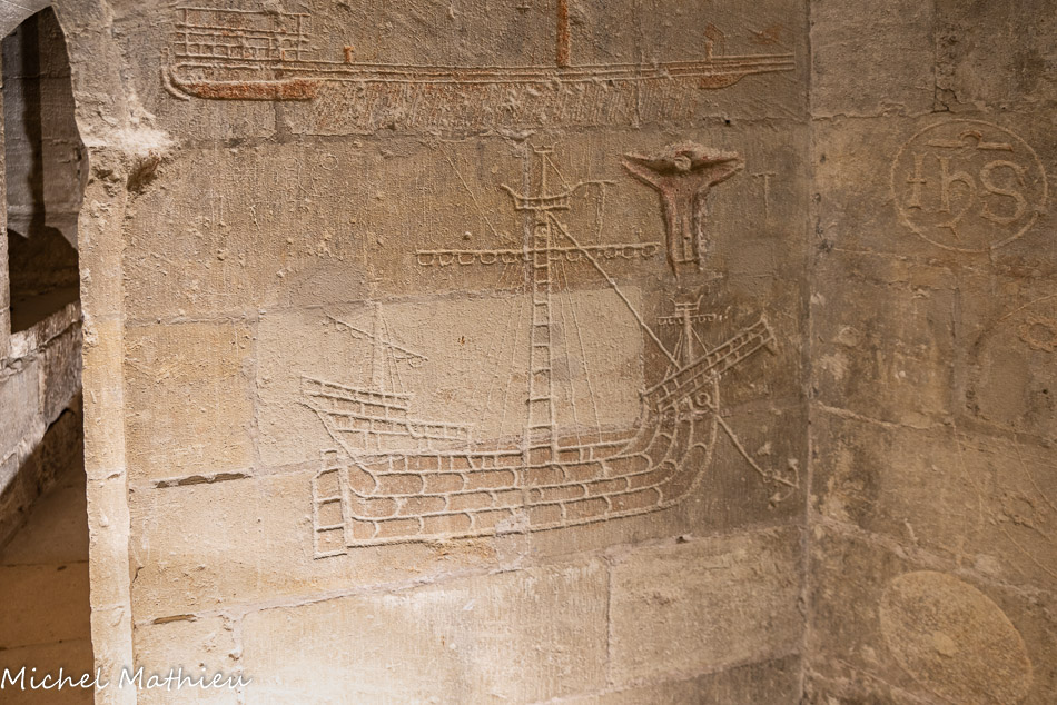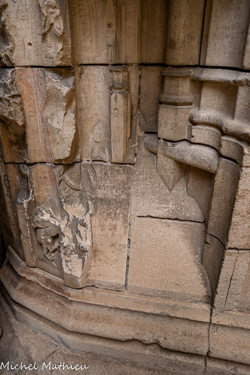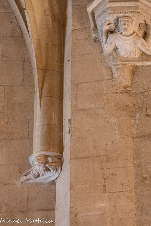 Elles sont surmontées à l’extérieur de reliefs sculptés, très abîmés, illustrant des corps de métiers : un petit tonneau évoque le serviteur chargé des boissons, l’échanson.