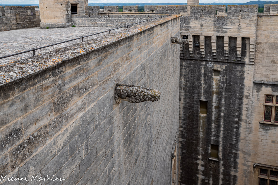 La Tour carrée du sud-ouest et la Tour ronde des Chapelles. C'est le château proprement dit, constitué d'une muraille de 3 à 4 m d’épaisseur et de 45 m de haut avec deux tours rondes (tour de l'Horloge et tour des Chapelles) à l'est et deux tours carrées à l'ouest côté Rhône. Les architectes avaient adopté, pour la façade la plus exposée, des tours rondes plus résistantes et faciles à défendre que les tours carrées. Cette survivance de l'emploi des tours carrées, à une époque où dans le reste de la France on y avait renoncé, marque un certain archaïsme. Une des caractéristiques de ce château est d'avoir des courtines de même hauteur que les tours qu'elles relient créant ainsi un niveau de défense et de circulation continu : c'était une tendance déjà ancienne qu'on trouve par exemple à la Bastille de Paris. L'aile méridionale n'a pas de fenêtre côté sud, car elle est la plus exposée en cas d'attaque. Les seules fenêtres donnent sur la cour d’honneur. Elle est desservie par un escalier à vis situé dans la tour du Rhône (angle sud-ouest) qui présente un pan coupé. Les créneaux avaient disparu au XIXe siècle, alors que l'édifice était mal entretenu. Les Monuments Historiques les ont rétablis en 1894-97.
