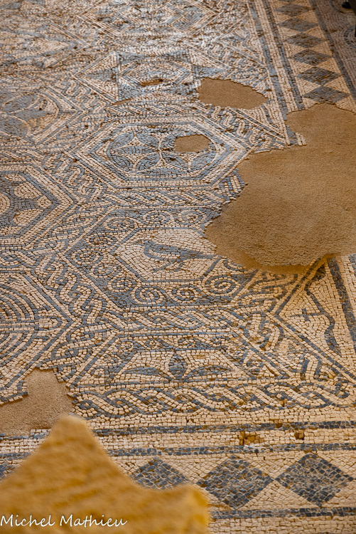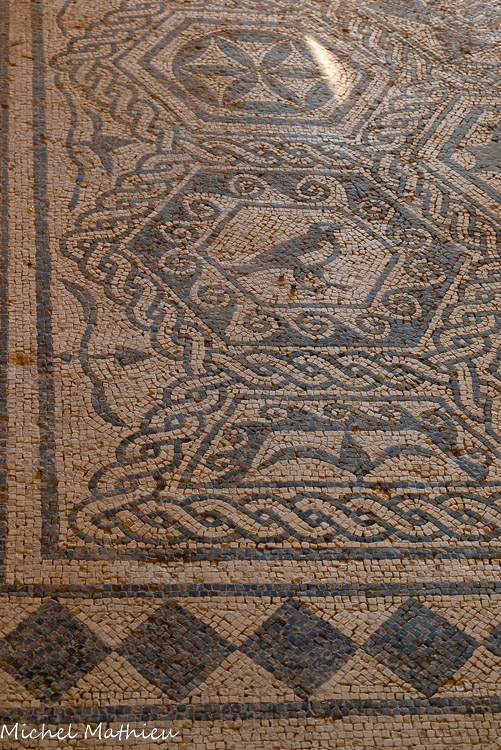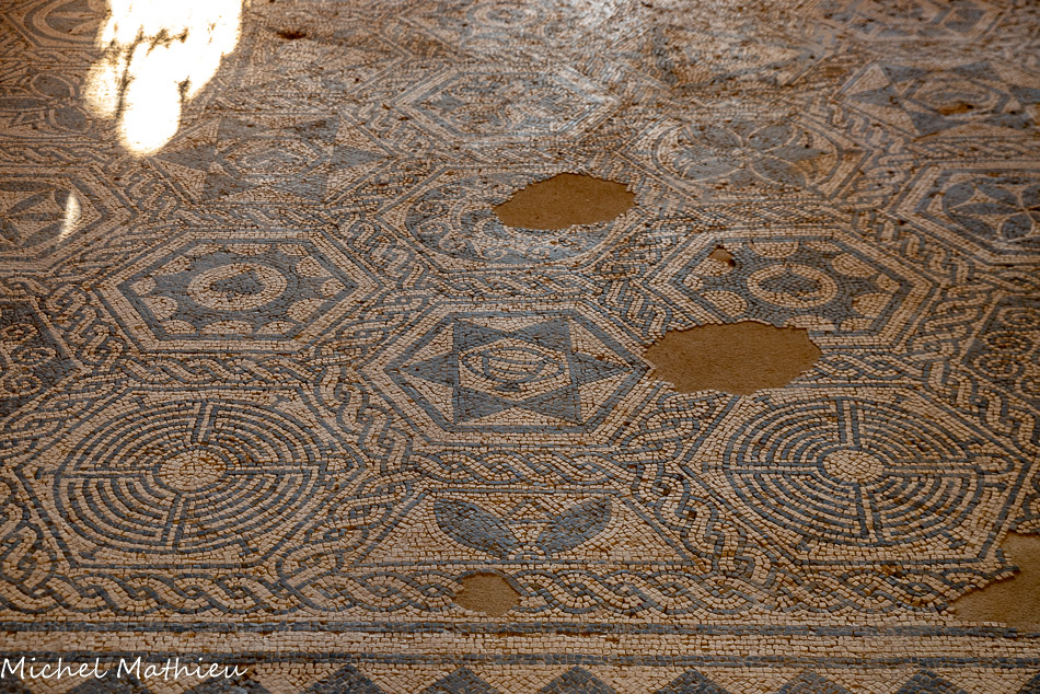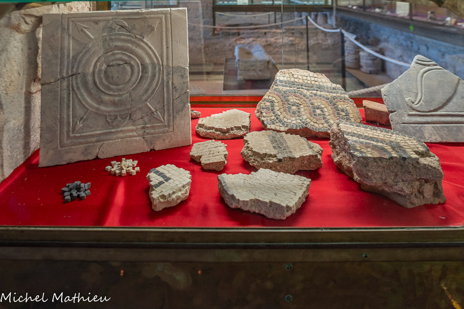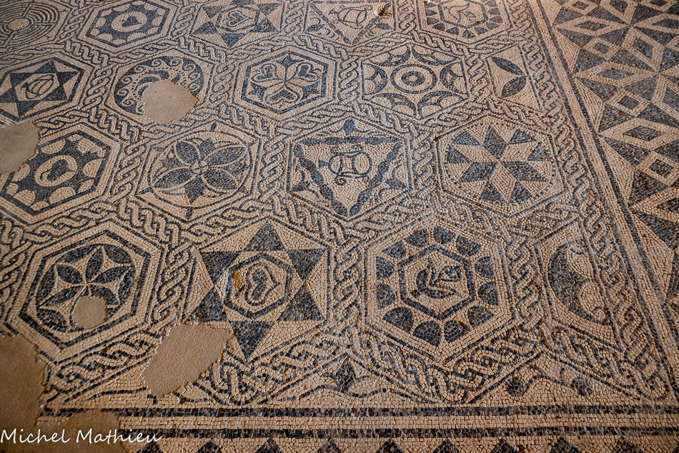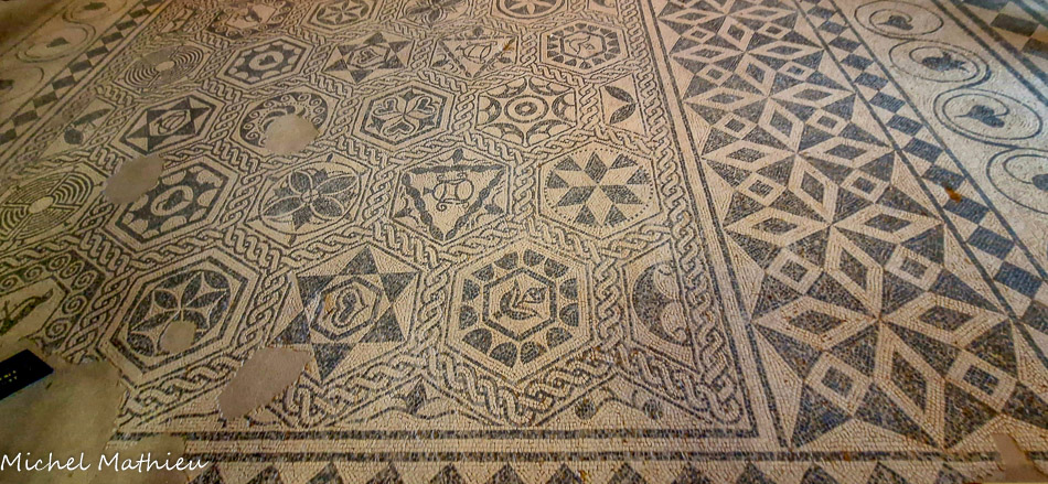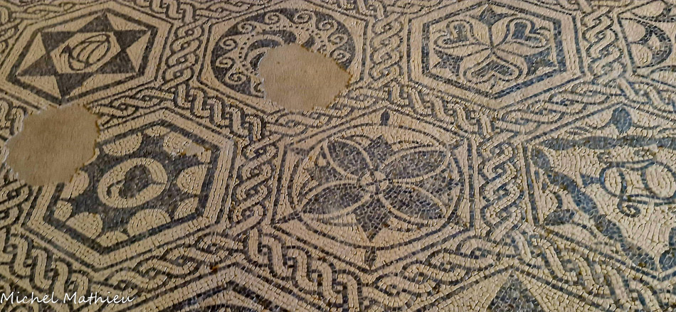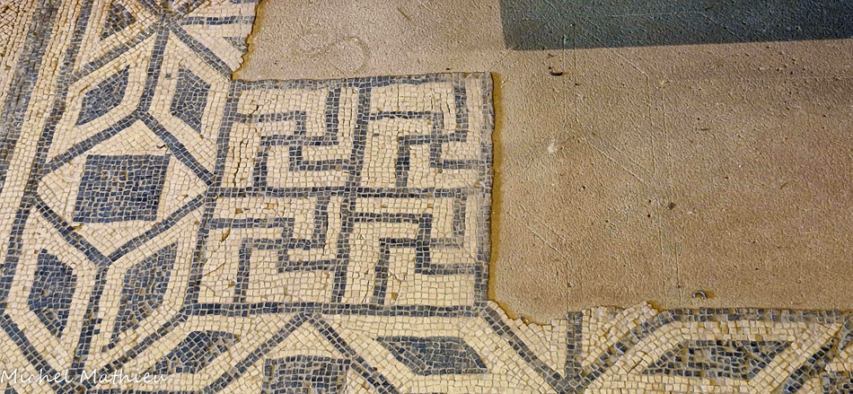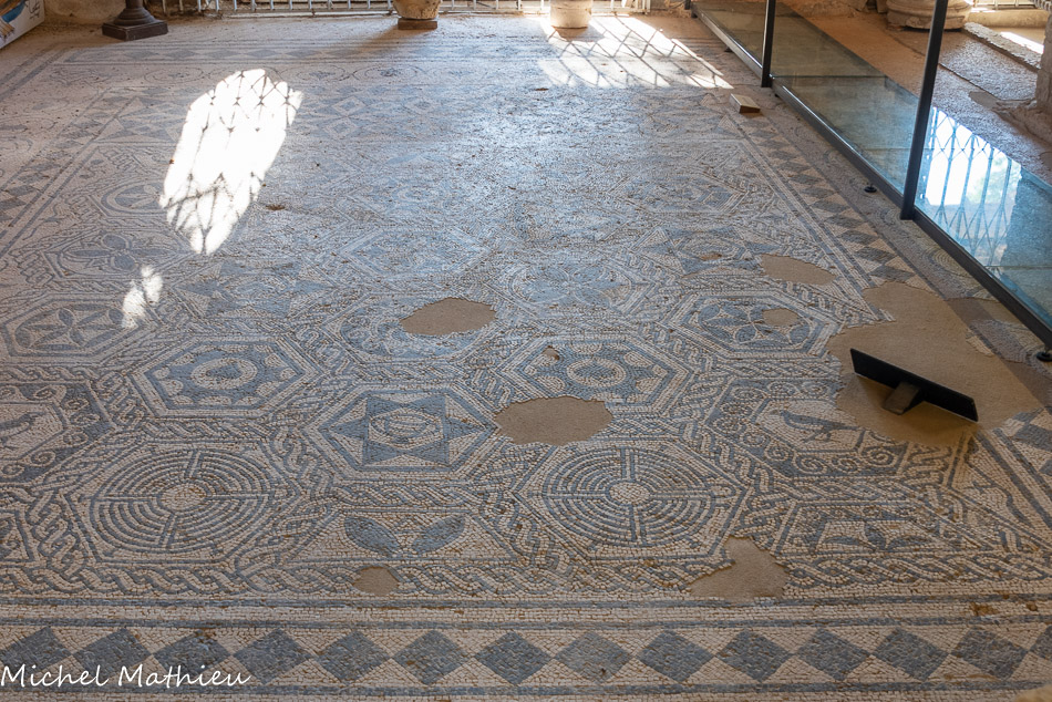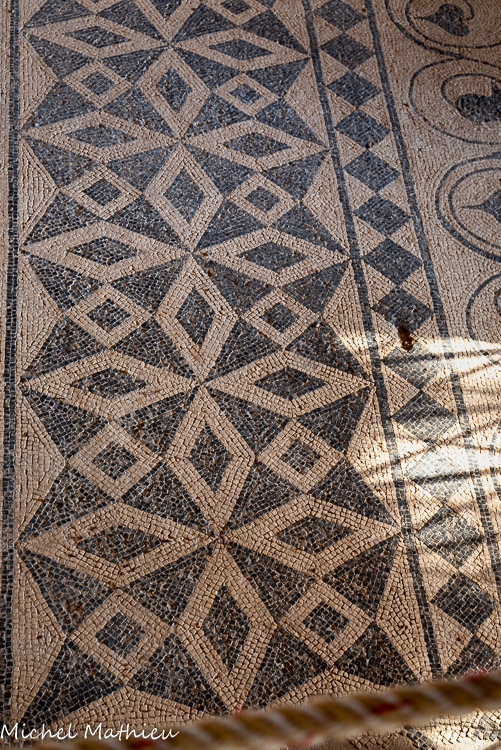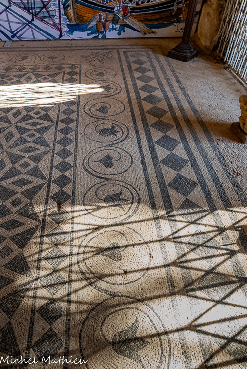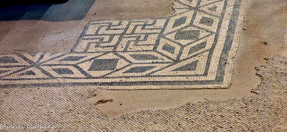 Au sol une mosaïque aux motifs géométriques raffinés réalisés avec des tesselles noires et blanche, du Ier s. après J.-C., de type hellénistique. Les mosaïques étaient construites par des ateliers itinérants-; Le pictor imaginarius traçait un dessin et choisissait les couleurs. Après le report du dessin par le pictor parietarius, les tesselles étaient coupées et posées; Restait le travail le plus difficile, la pose du décor figuré.