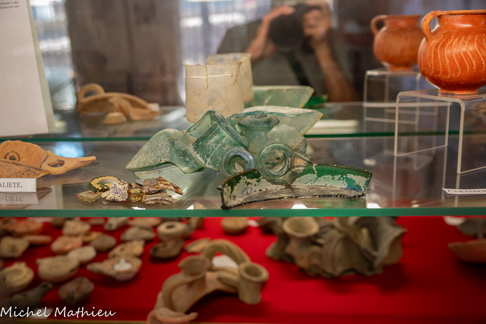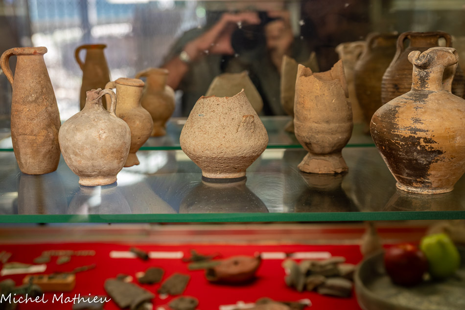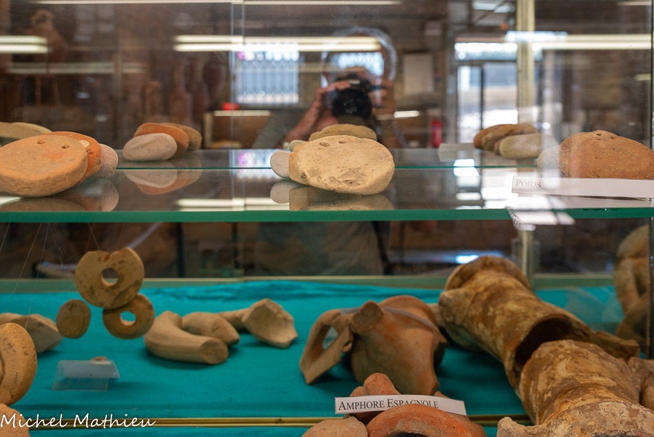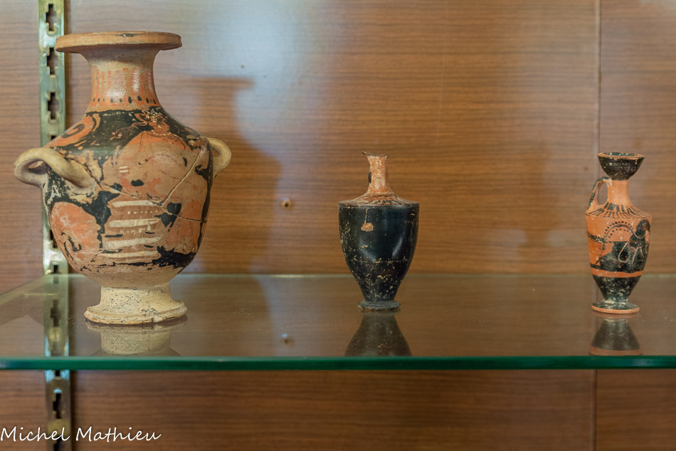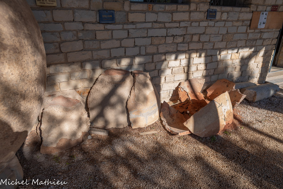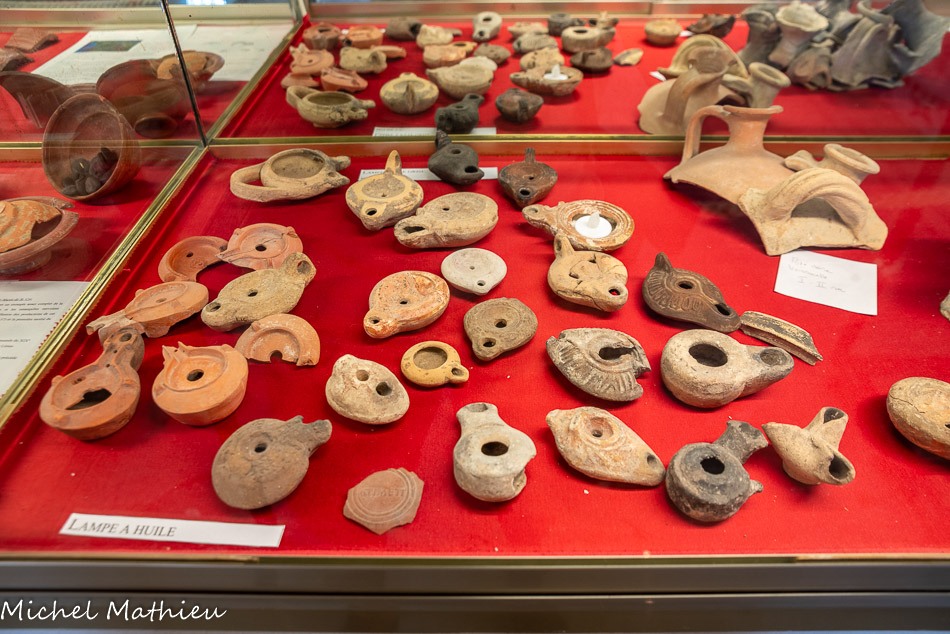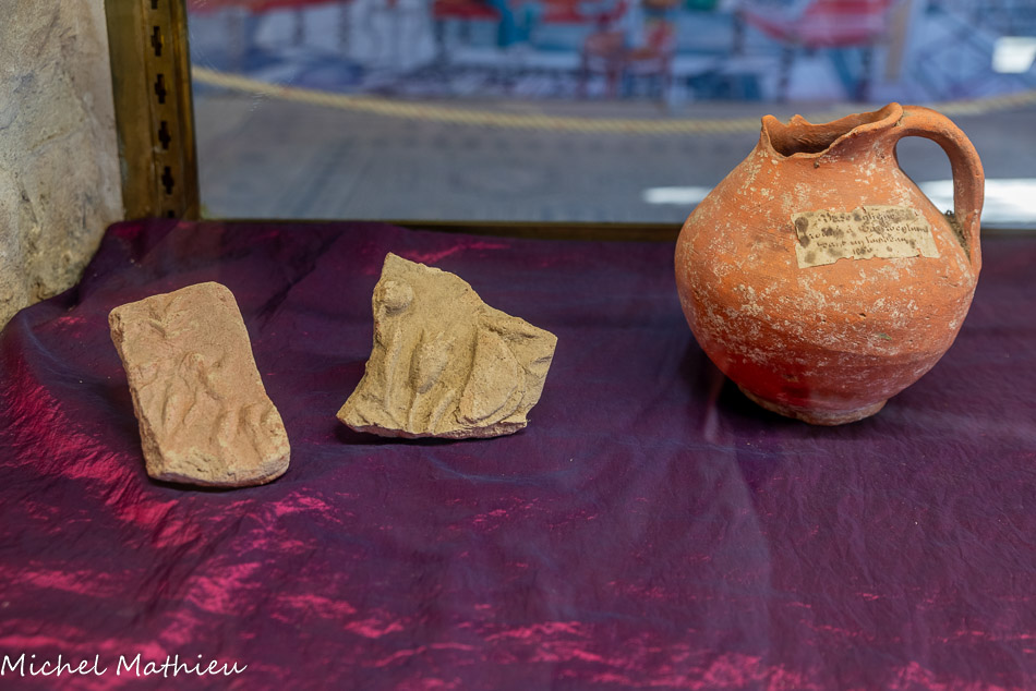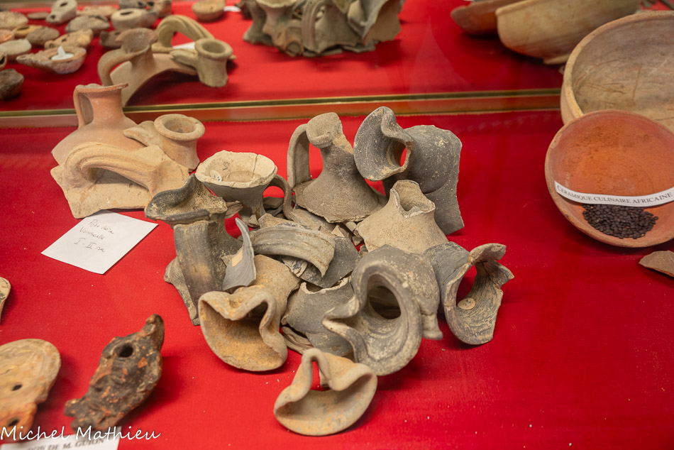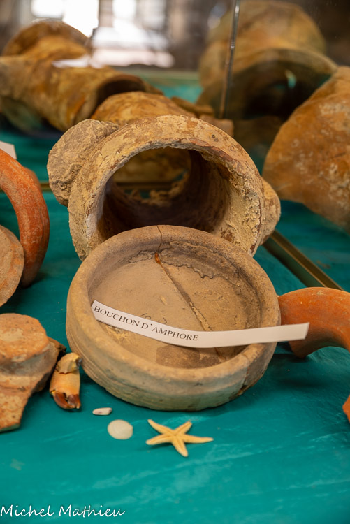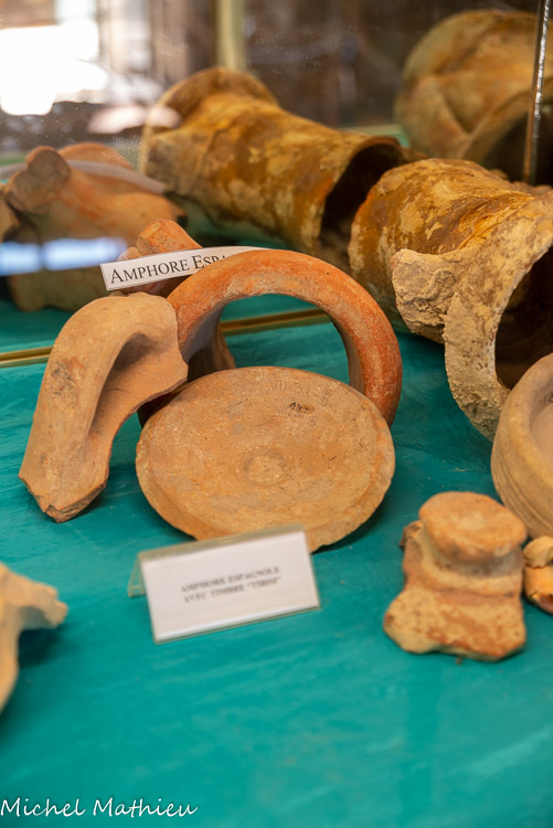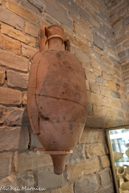 Accrochée au mur de gauche, une collection d’amphores à vin, donc italiques à anses longues et venant de la région de Pompéi. Leur fond pointu permettait de les caler dans les bateaux de transport avec du sable et des branchages. Les deux premières à gauche : Amphore gréco-italique de type Lyding-will e datation -175/-100. Puis trois Amphores de type Dressel 1A datation : -135/-50. Une Amphore de type Dressel 1 B datation -100/-1. Deux Amphores de type Dressel 1A datation : -135/-50. La dernière, Amphore de type Dressel 2-4 datation : -30/150.