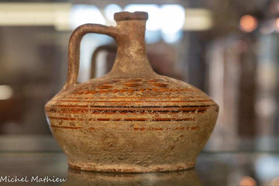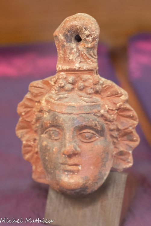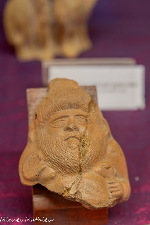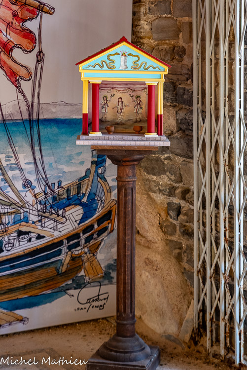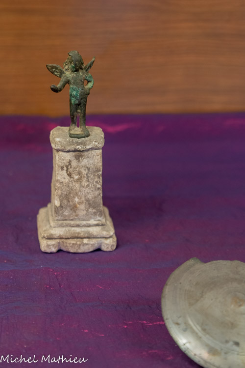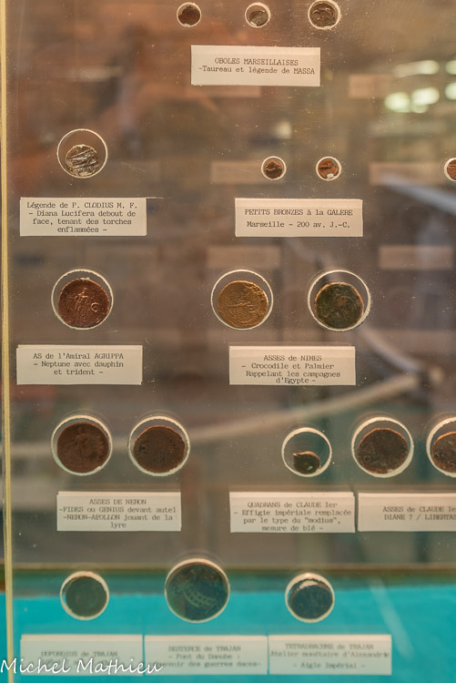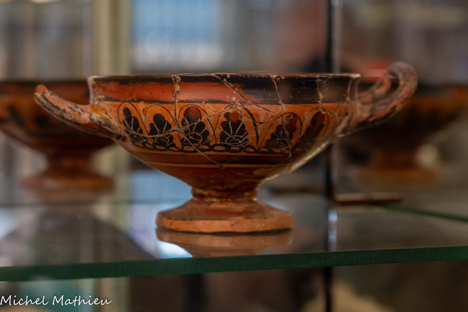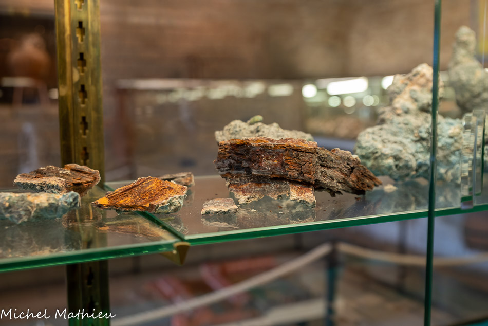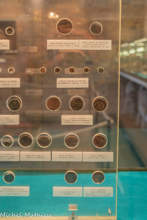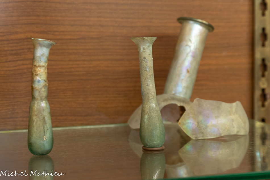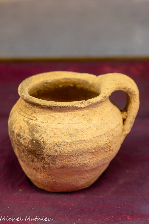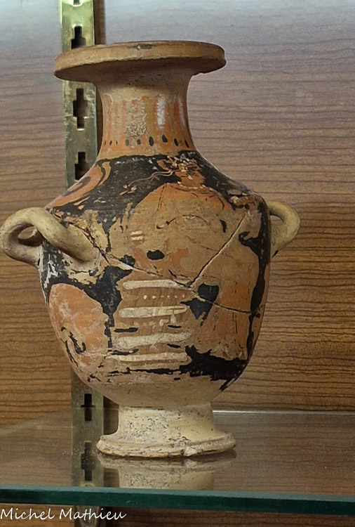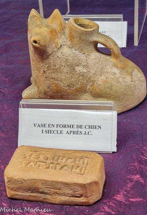 Accrochée au mur de gauche, une collection d’amphores à vin, donc italiques à anses longues et venant de la région de Pompéi. Leur fond pointu permettait de les caler dans les bateaux de transport avec du sable et des branchages. Les deux premières à gauche : Amphore gréco-italique de type Lyding-will e datation -175/-100. Puis trois Amphores de type Dressel 1A datation : -135/-50. Une Amphore de type Dressel 1 B datation -100/-1. Deux Amphores de type Dressel 1A datation : -135/-50. La dernière, Amphore de type Dressel 2-4 datation : -30/150.
