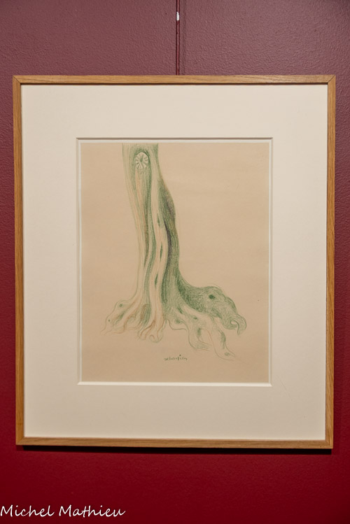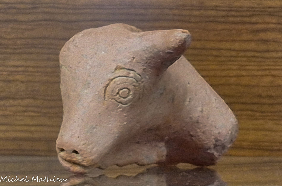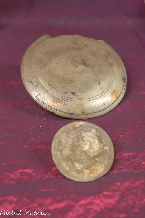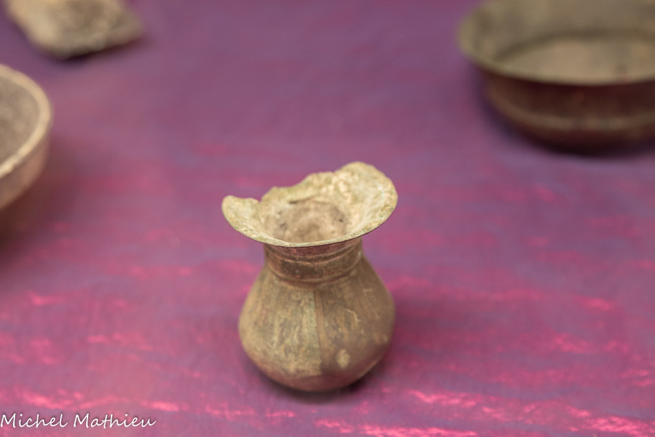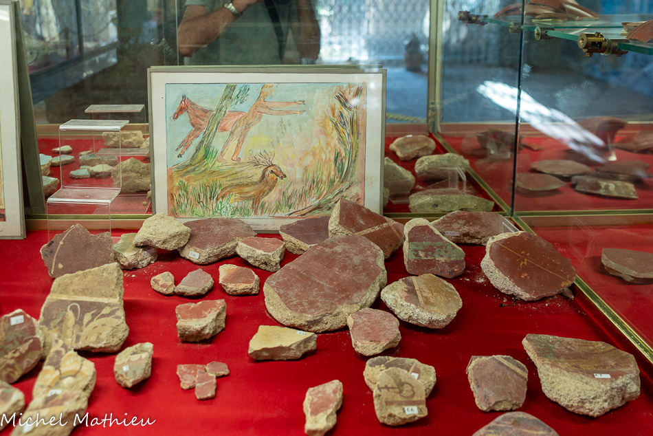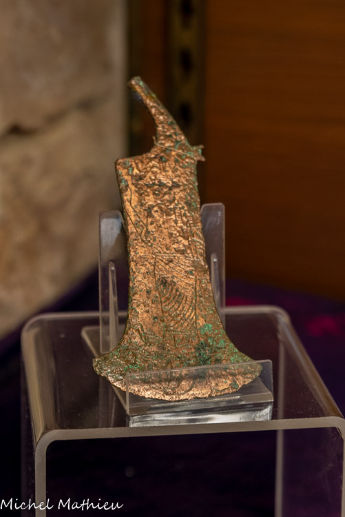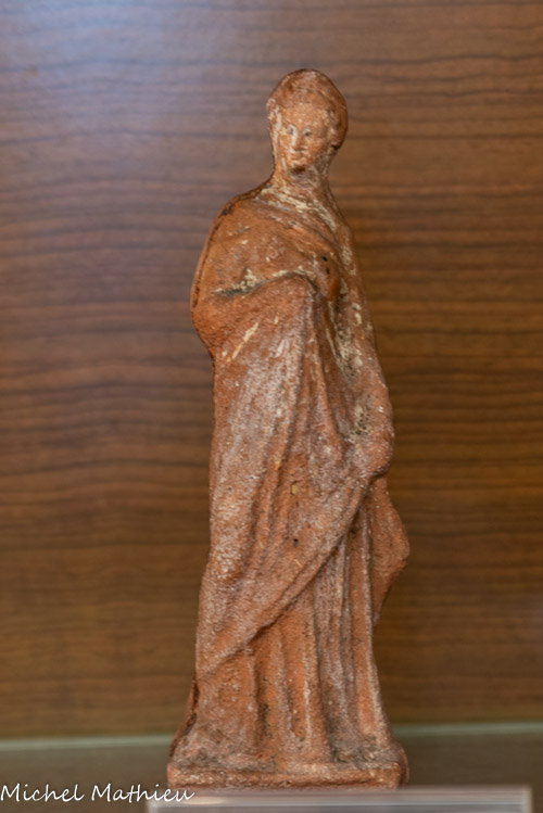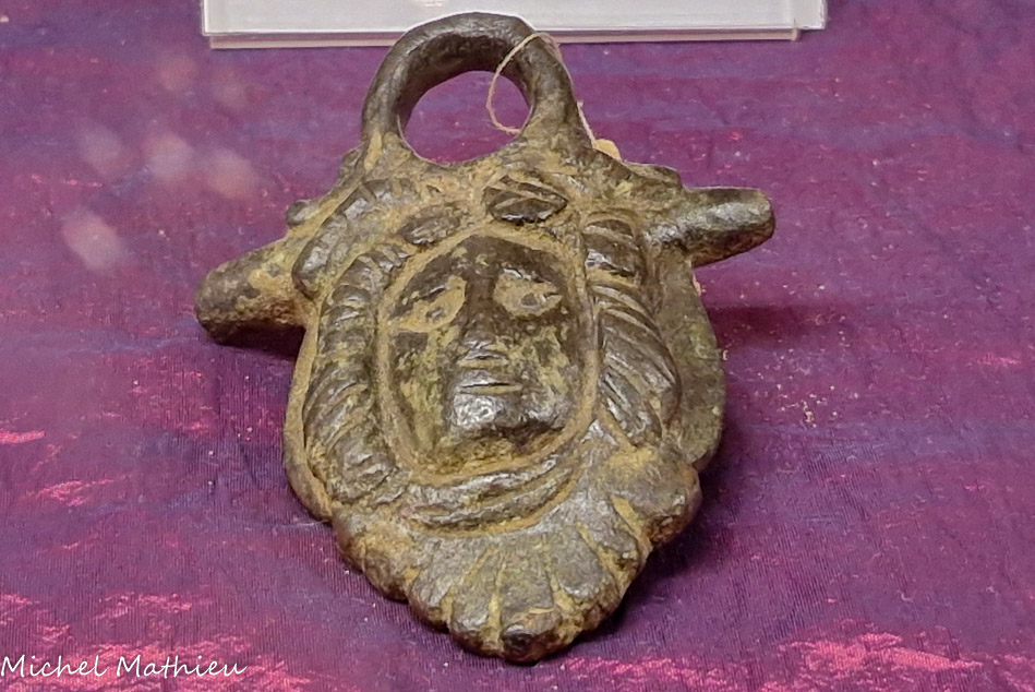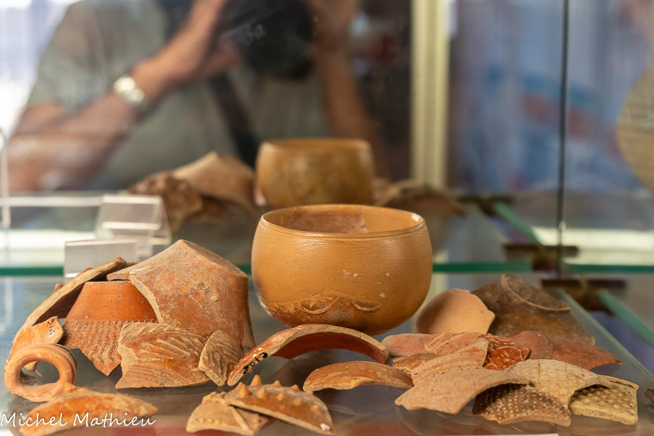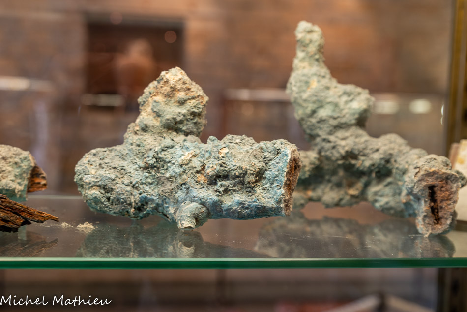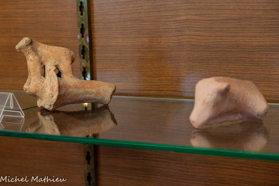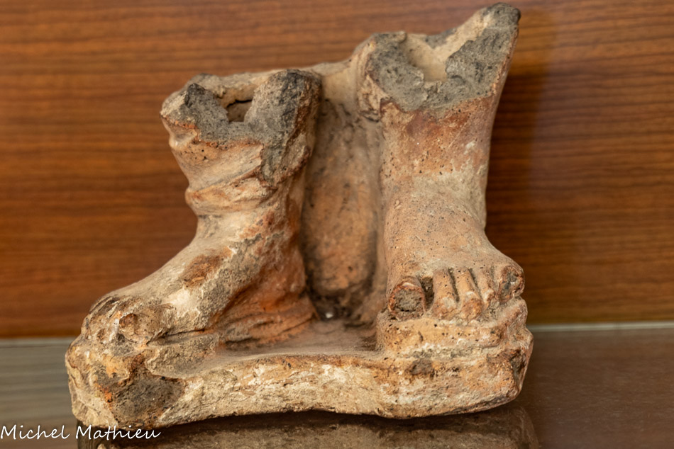 Accrochée au mur de gauche, une collection d’amphores à vin, donc italiques à anses longues et venant de la région de Pompéi. Leur fond pointu permettait de les caler dans les bateaux de transport avec du sable et des branchages. Les deux premières à gauche : Amphore gréco-italique de type Lyding-will e datation -175/-100. Puis trois Amphores de type Dressel 1A datation : -135/-50. Une Amphore de type Dressel 1 B datation -100/-1. Deux Amphores de type Dressel 1A datation : -135/-50. La dernière, Amphore de type Dressel 2-4 datation : -30/150.