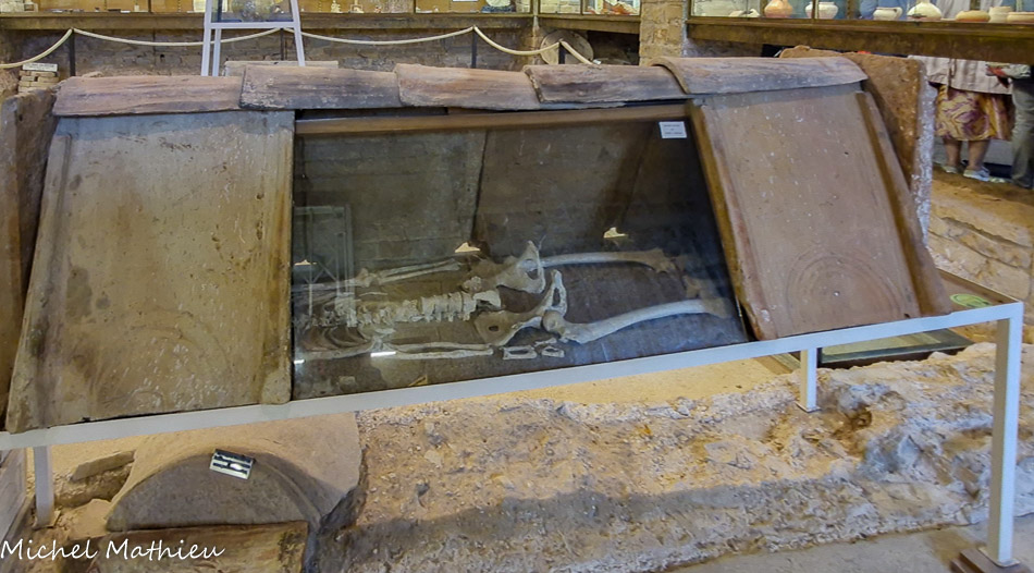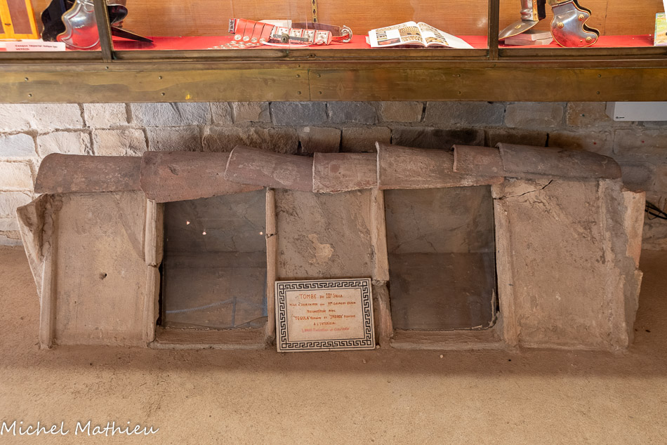 Une tombe en bâtière du IIIe siècle, construite avec deux sortes de tuiles (tegula romaine et imbrex moderne). Cette tombe contient le squelette d’une jeune femme d’une dizaine d’années, de classe sociale intermédiaire puisqu’elle n’a pas été déposée dans un sarcophage. Quant aux pauvres ou aux esclaves, leurs corps étaient directement ensevelis enveloppés d’un linceul.