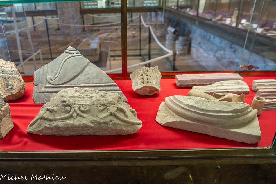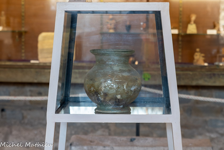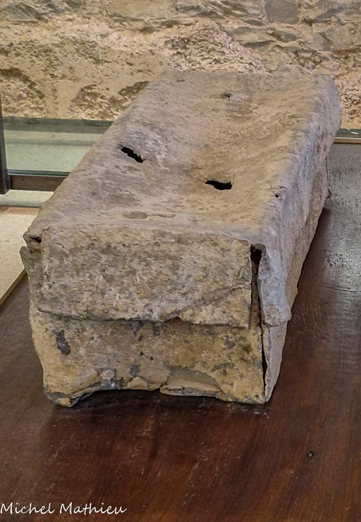 Ce type de construction est d’origine orientale. Il est daté du IVème siècle. La chambre inférieure à parements de marbre blanc et gris contenait le cercueil de plomb qui se trouve dans la salle centrale du musée. Ce cercueil contenait le squelette, ainsi que des offrandes : lampe à huile, cruche à pâte claire, noyaux d’olive.