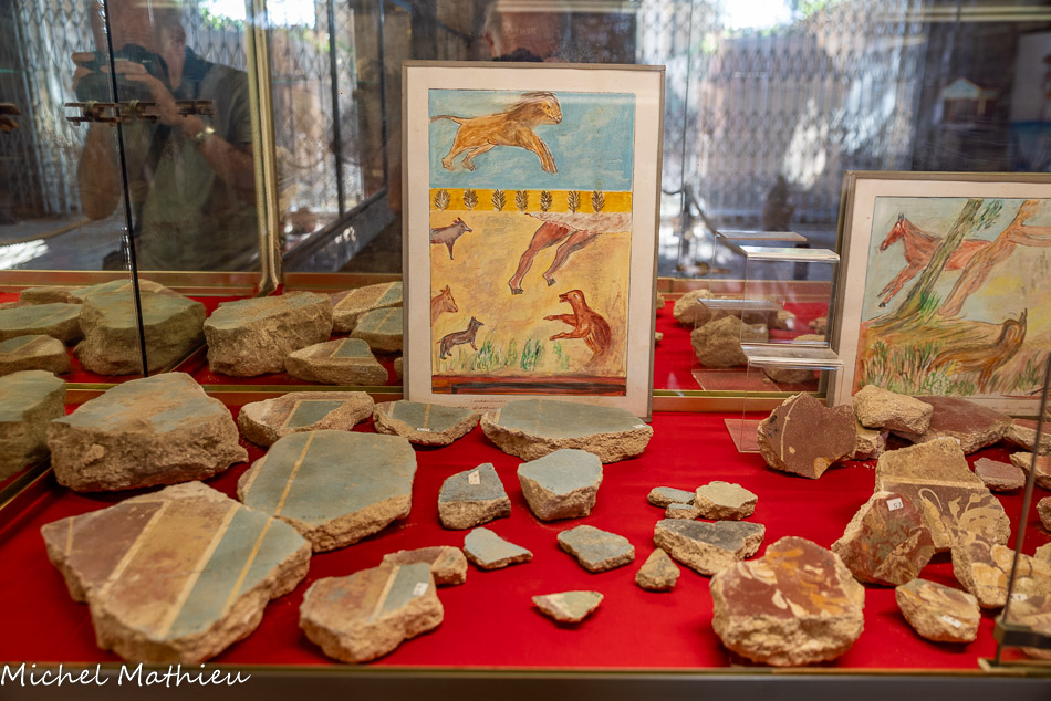 Nous entrons dans le cœur de la villa, l’atrium, et les pièces nobles réservées à la famille du maître de maison. De plan quadrangulaire, il est ici ceint de pièces bâties sur seulement trois côtés compte-tenu de la déclivité du terrain, le quatrième étant occupé, au sud, par le mur de soutènement, haut de 2,85 m, de la terrasse correspondant au niveau V. Devant la fresque, il se trouvait une pièce avec 4 piliers centraux, dont il ne reste que les bases.