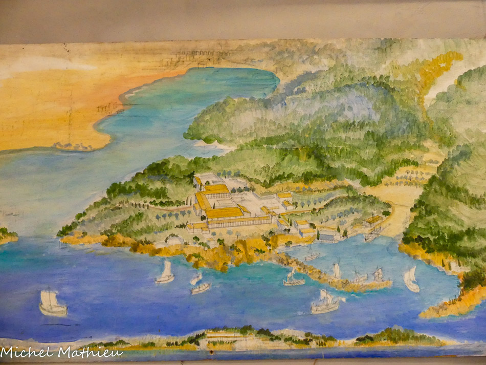 Cette fresque donne une excellente idée de l'apparence des bâtiments au Ier siècle. L'ensemble représenté ici est bien sûr une évocation de l'ambiance pas une reconstitution, mais s'appuie sur les résultats des fouilles. D'où la présence en arrière-plan d'une tour de vigie ou plutôt d'une loggia dont il ne reste plus que les fondations, et de fresques murales. Elle donne une très bonne idée de la vue grandiose dont on pouvait jouir depuis la pars urbana.