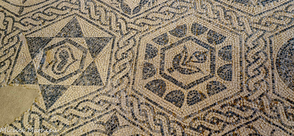 Les motifs géométriques raffinés réalisés avec des tesselles noires et blanches.
