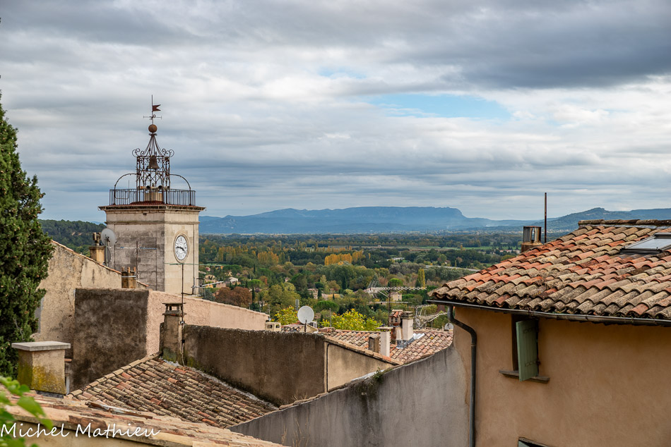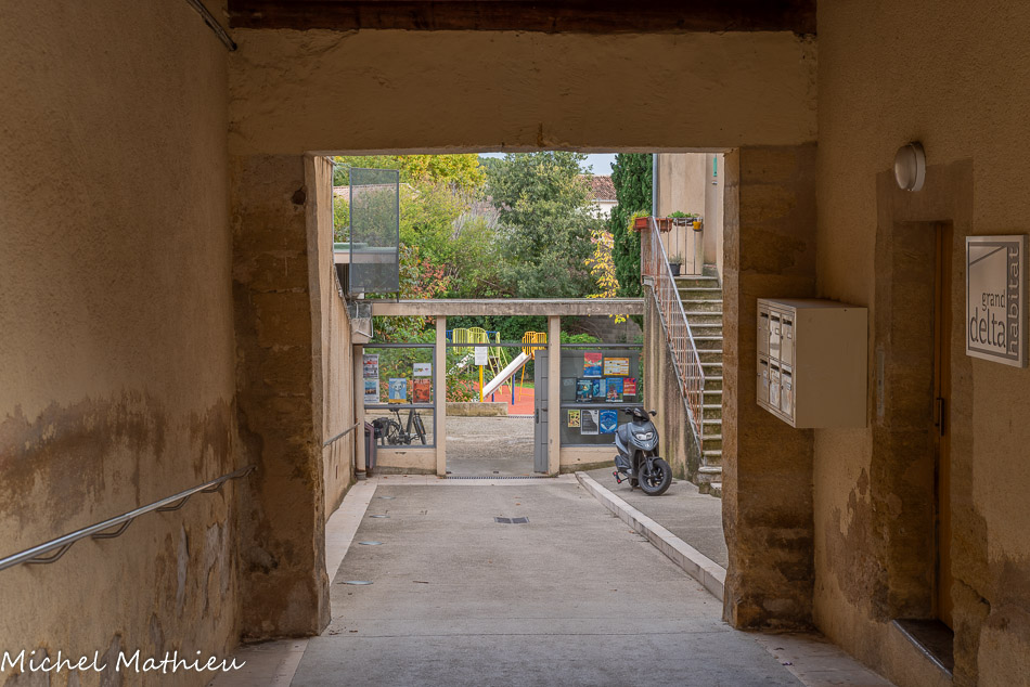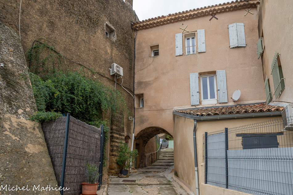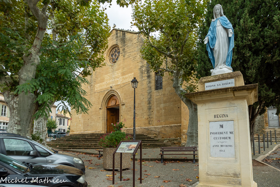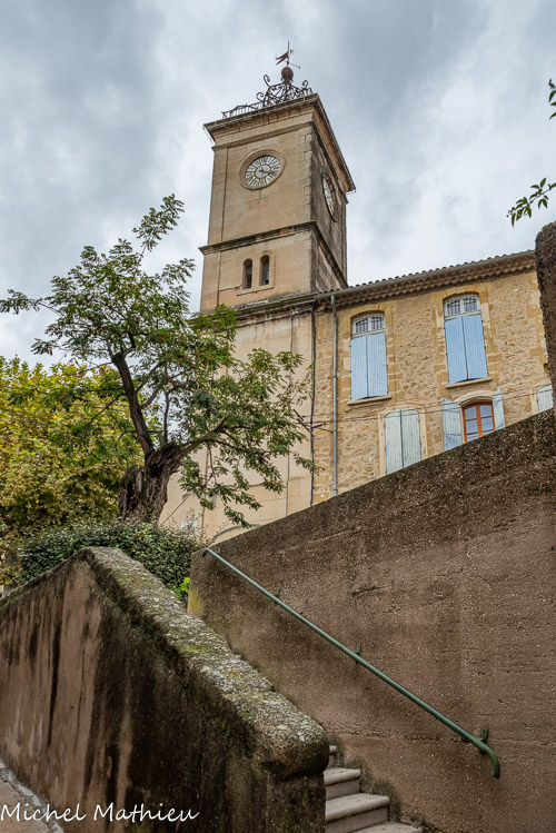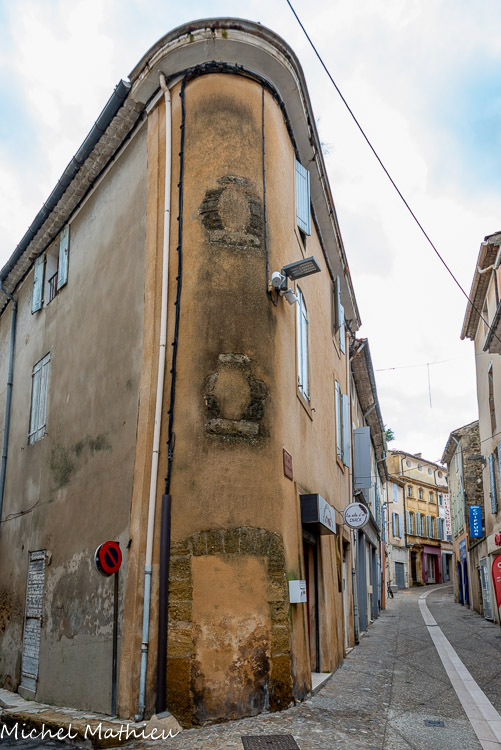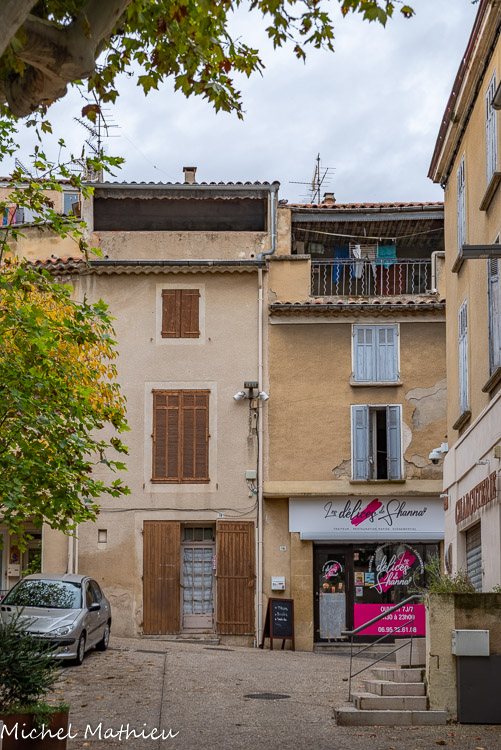 Le bâtimets en arrière plan sont sur le tracé de l'ancien rempart. De 1545 jusqu’au 19e siècle, Cadenet était ceinturé par un rempart. Au fil du temps, le village s’agrandissant et le besoin de protection devenant inutile, les maisons se sont appuyées dessus. Le rempart disposait d’une série de tours qui défendaient quatre portes au total. Ici, le chemin de ronde dont il ne reste qu’un petit vestige, permettait d’accéder à la porte dite Sainte-Anne se situant entre les deux bâtiments, elle est actuellement matérialisée par les deux plots se trouvant au sol.