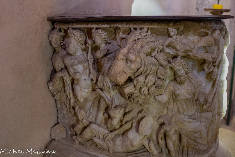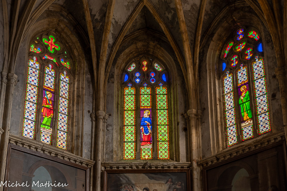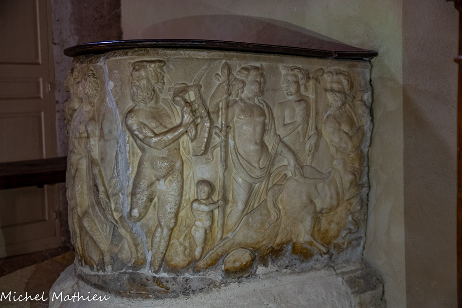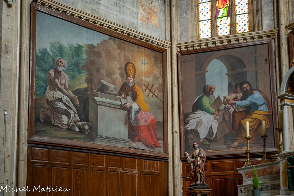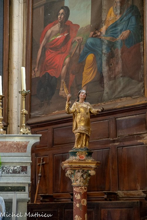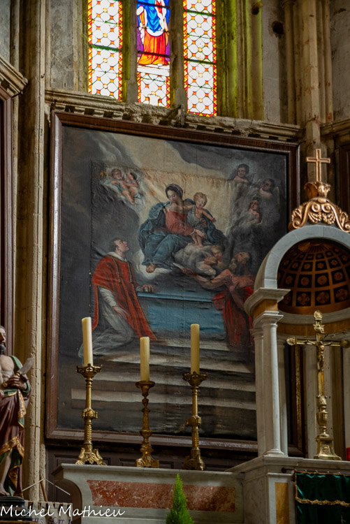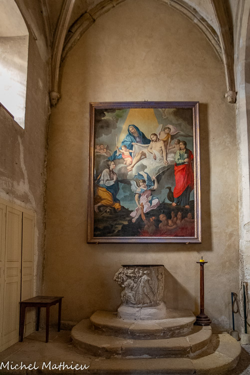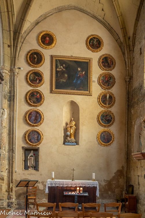 Chapelle de la Vierge avec Jésus debout sur un globe céleste. Elle est ornée d’un ensemble de tableaux représentant Les mystères du rosaire du XVIIème. Ces tableaux proviendraient de l’ancien couvent des Dominicains.