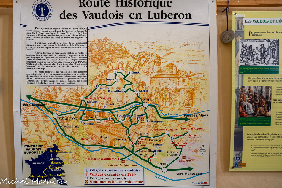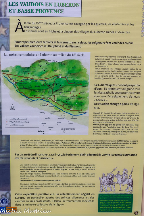 En ces lieux, il y a cinq siècles, vécurent et souffrirent des Vaudois, ces Pauvres de Lyon, fils de Valdes, pourchassés à travers l'Europe. Ici, ils étaient venus des vallées françaises du Briançonnais et de celles du Piémont, pour remettre en culture les terres en friches des seigneurs du Luberon. Travailleurs infatigables le jour, ils se réunissaient clandestinement la nuit autour du chandelier et de la Bible traduite en langue occitane, auprès de leurs prédicateurs itinérants, leurs "Barbes". A partir du synode de Chanforan en 1532, où les Vaudois se fondirent dans le mouvement de la Réforme, l'Inquisition se durcit. Le célèbre "Arrêt de MÉRINDOL" condamnant 19 Vaudois "hérétiques" sera très largement exécuté au cours d'une triste semaine d'avril 1545. Une vingtaine de villages furent mis à feu et à sang, dont 11 strictement "exécutés" par la soldatesque de Meynier d'Oppède et les mercenaires du Pape. 1551. Blanche de Lévis-Ventadour, dame du Château de Lourmarin, était une femme courageuse et généreuse. Elle protégea ses paysans vaudois pourchassés, informa le roi sur les agissements du baron d'Oppède et intenta un procès en 1551. A l'issue du procès le baron fut condamné à payer des dommages aux survivants des massacres. Il faut attendre l'Edit de Nantes promulgué par Henri IV en 1598 pour que le village de Lourmarin retrouve la paix.