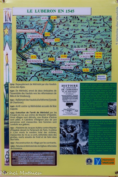 1545 : Exécution de l’arrêt de Mérindol par les troupes du roi, aux ordres de Maynier d’Oppède. Onze villages sont détruits, une dizaine d’autres sont pillés. A Cabrières d’Avignon plus de 300 personnes sont massacrées. 600 hommes sont conduits aux galères.