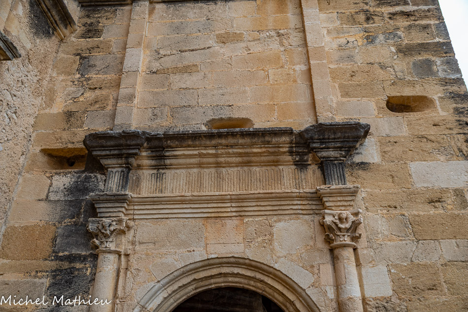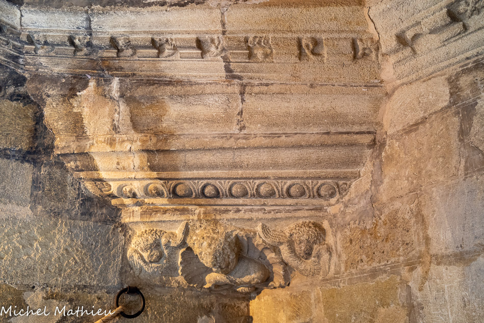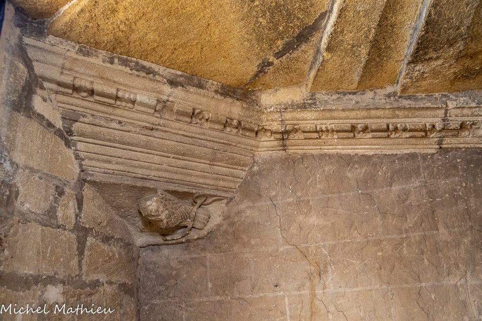 La portail est surmonté d'une arcature à double rouleau, avec un rouleau d'archivolte à palmettes.