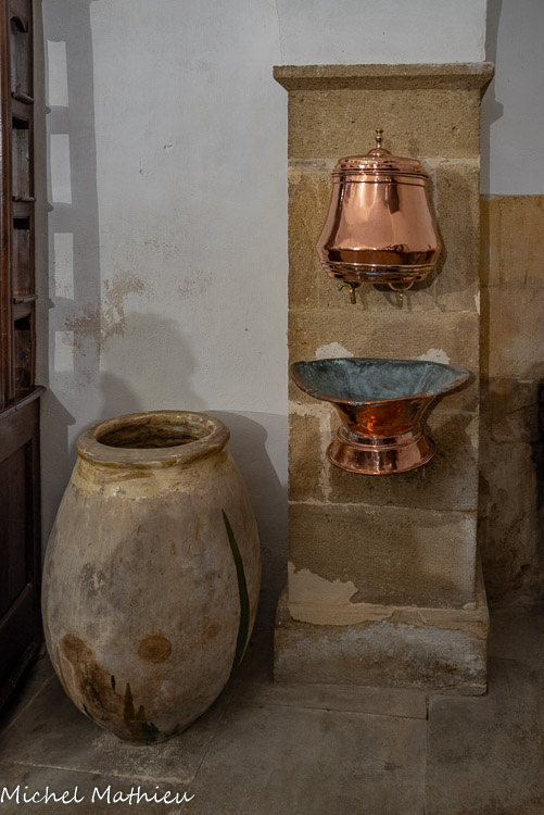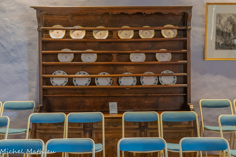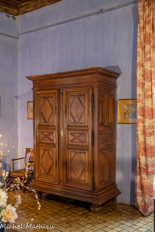 Un ensemble de trois bibliothèques datant de la fin du 18ème siècle. A l’origine ce sont des meubles de sacristie provenant d’un monastère ou d’une église d’Avignon, où les papes ont résidé entre 1309 et 1418. Sur la bibliothèque à côté de la petite porte vous pouvez observer une tiare papale et des emblèmes religieux. Un coffre Renaissance surmonté d'une gravure (école française du 17ème) représentant une Descente de Croix d’après Paul Rubens.