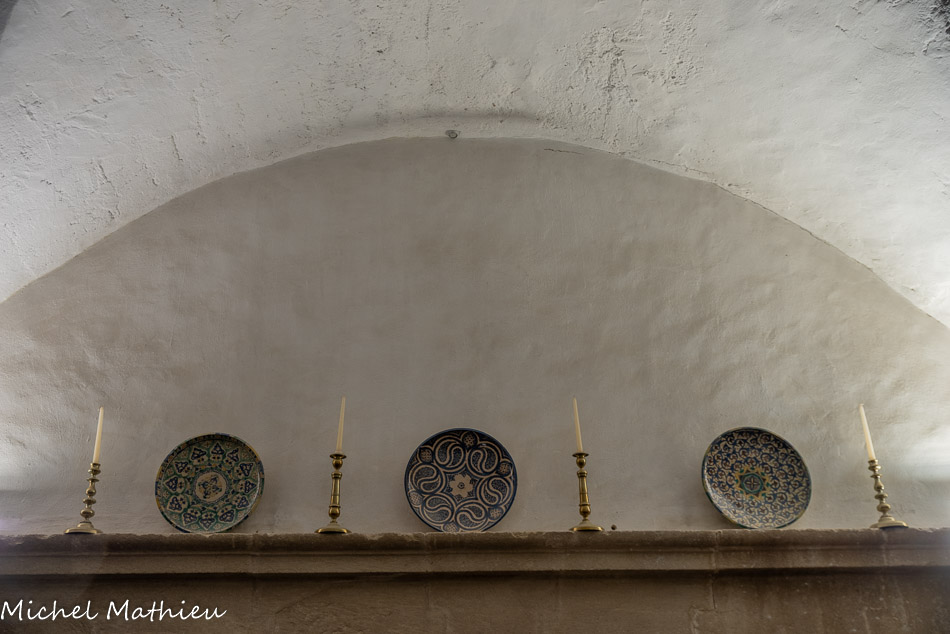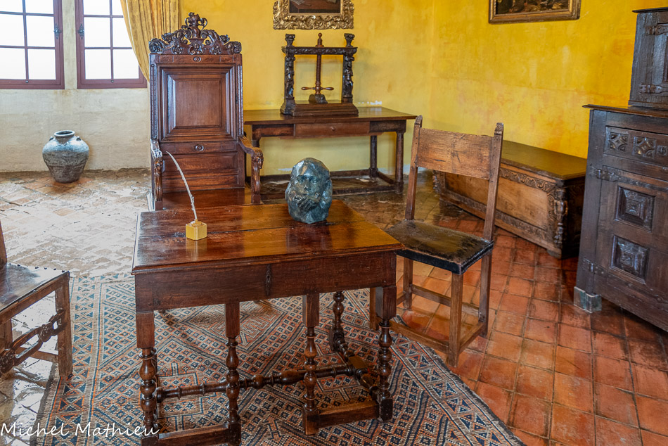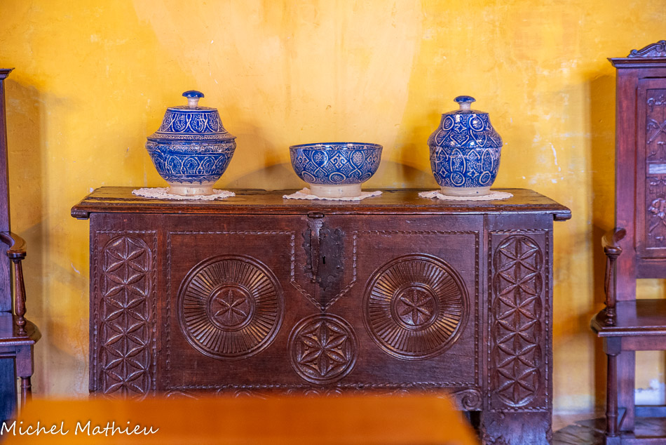 La Sallestre. Sur la cheminée, vases et coupes de céramique. Fin du I9ème-début 20ème siècle, Maroc. Céramiques de la ville de Safi pour les pièces de couleur verte et de Fez pour celles de couleur bleue. Deux fauteuils Louis XIII. 17ème siècle, France. En noyer et tissu en «point de Hongrie », de style transitoire Louis XIII-Louis XIV et une table pliante Louis XIII.