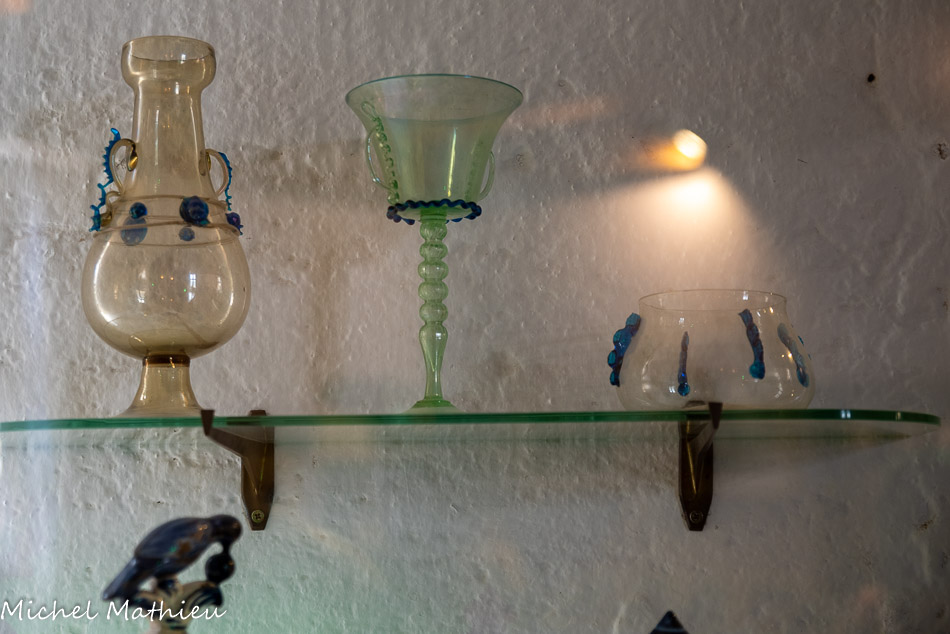 Salle de musique. Trois vitrines présentent une collection de verrerie funéraire romaine, du 2éme-3ème siècle après J. C. . de part et d'autre de la commode « Arbalète ». La commode Arbalète est une commode provençale de style Louis XV qui possède une façade galbée en forme d'arbalète, elle s'ouvre par 2 ou 3 tiroirs.