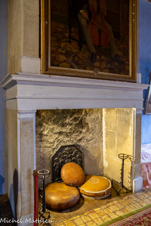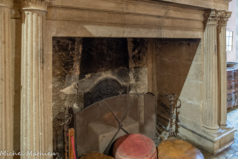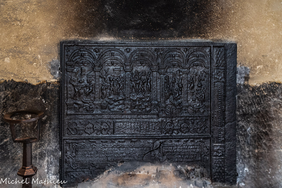 Le petit salon. Dans la cheminée, une plaque en fonte de la 2ème moitié du 16ème siècle dans le style de la Renaissance. L’inscription effacée par le feu ne permet plus d’identifier les scènes représentées : certains y voient le martyre de saints et d’autres le massacre des Vaudois.