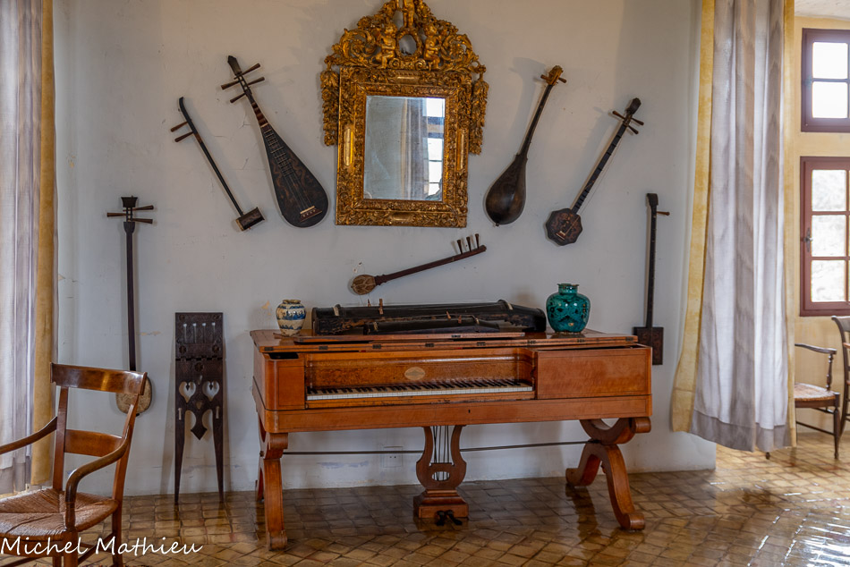 Salle de musique. Pianoforte. Daté 1833, œuvre du facteur Boisselot, Marseille, en bois de citronnier. Le pianoforte fut inventé en Italie dans la première moitié du 18ème siècle par Cristofori. Il est à cordes frappées, comme le piano (i9ème siècle) mais sa sonorité est plus proche du clavecin.