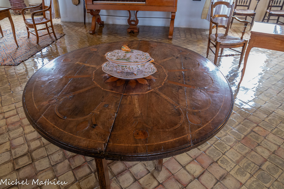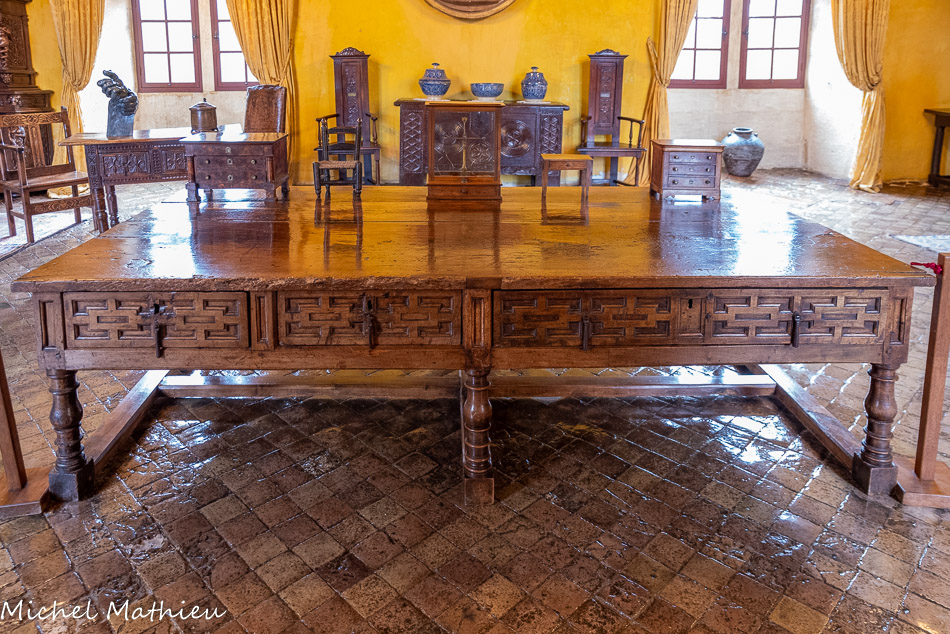 Salle de musique. Table de vendange. 17ème siècle, France, noyer. Table pliante à motifs incrustés de bois clairs. Décor d’arcatures, de feuilles et de fruits. Elle était utilisée une fois par an, aux vendanges, pour le paiement des taxes. À partir de 1789, durant la Révolution Française, elles ont en grande partie détruites, étant le symbole de la tyrannie.
