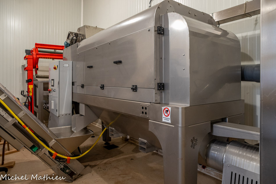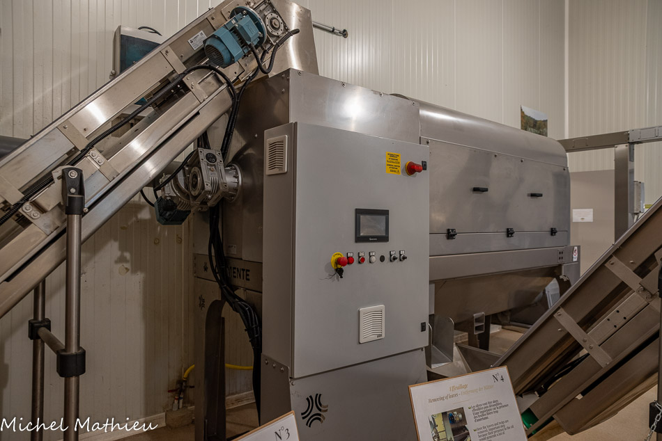 A gauche, le laveur, à droite l'effeuilleur, au centre le tapis roiulant qui permet aux olives de passer de l'un à l'autre. A la sortie de l'effeuilleur, l'aspirateur à feuiiles qui permet de les écacuer.