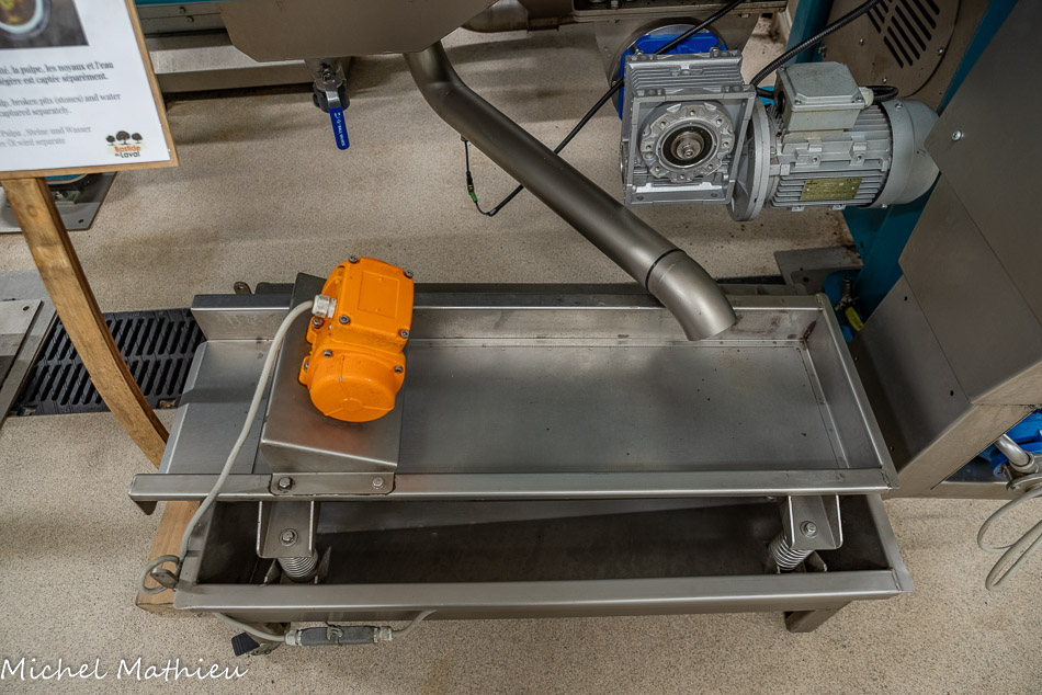 Dans ce bac, sous le simple effet de leur différence de densité, la pulpe, les noyaux et l’eau sont éliminés par la centrifugeuse et l'huile plus légère est captée séparément