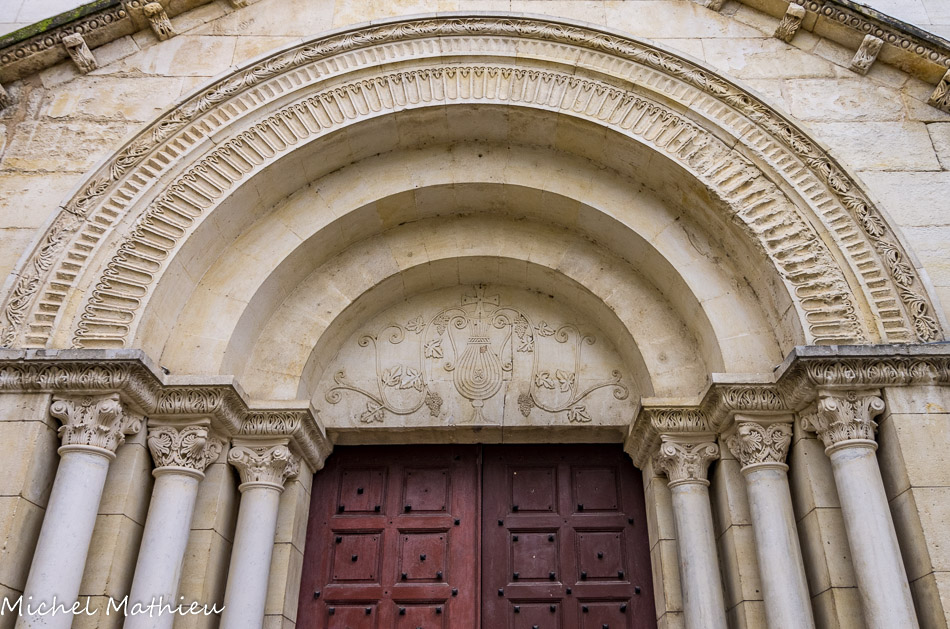Beaumes-de-Venise. Eglise saint Nazaire. Le tympan au-dessus du portail d'entrée s'inspire d'un décor antique de la chapelle Saint-Quenin de Vaison-la-Romaine. Il représente un vase d'où sortent des pampres de vigne (rejets issus des bourgeons qui donnent des sarments). La vigne est doublement symbolique : le vin représente le sang du Christ dans la liturgie catholique ; il est également un produit emblématique du terroir de la commune.