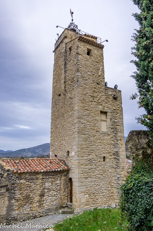 Malaucène. Le Beffroi situé en contrebas du Calvaire, sa construction décidée en 1482 ne fut terminée qu'en 1532. En 1678, l'horloge fut dotée d'un "repicq". Après de nombreuses réparations, le mécanisme de l'horloge fut remplacé par Cosme Brachet un spécialiste de Séguret et on en profita pour rehausser le beffroi en 1762.