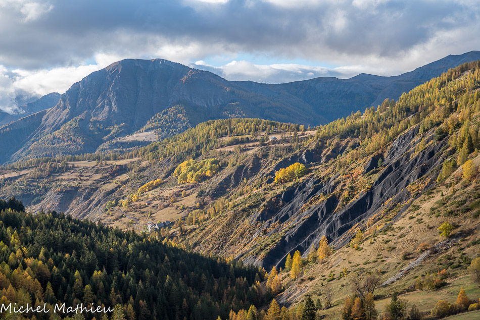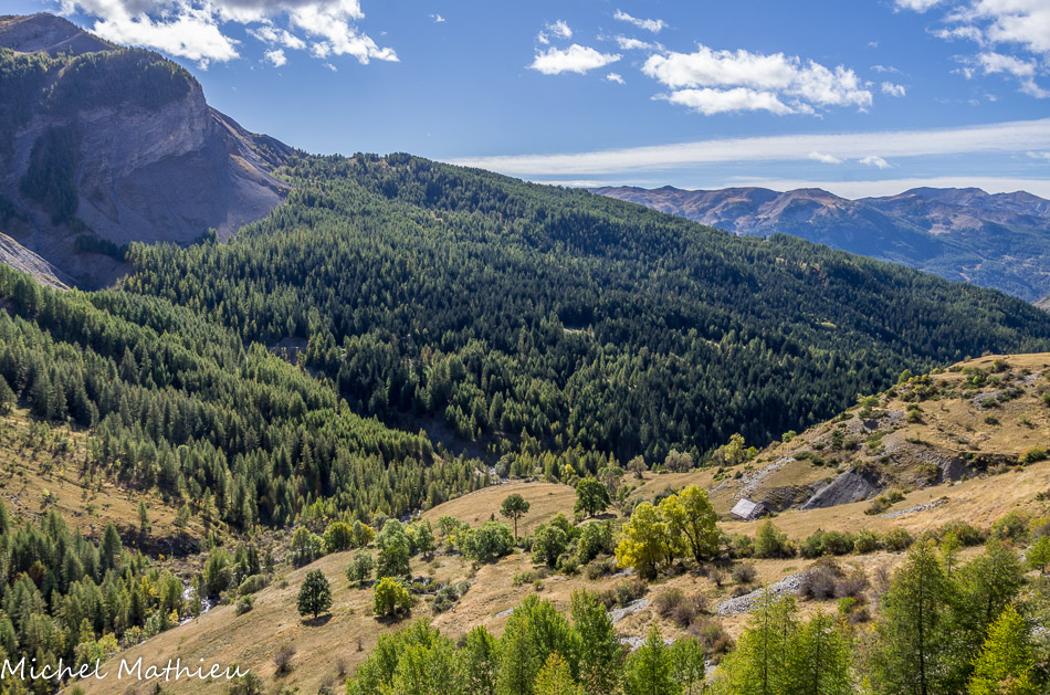Les montagnes du fond, de gauche à droite : le bout de Mourre Gros, la Tête Noire, la Tête de l'Estrop et les Trois Evêchés. A gauche, l'Autapie, à droite, Roche Grand. En bas, Notre Dame de Valvert.