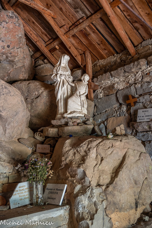 Construit en gros moellons (matériaux trouvés sur place)Clocheton à une baie surmontée d'une croix en pierre au dessus de l'entrée. Sur une pierre à droite est inscrite la date de construction, 1924.