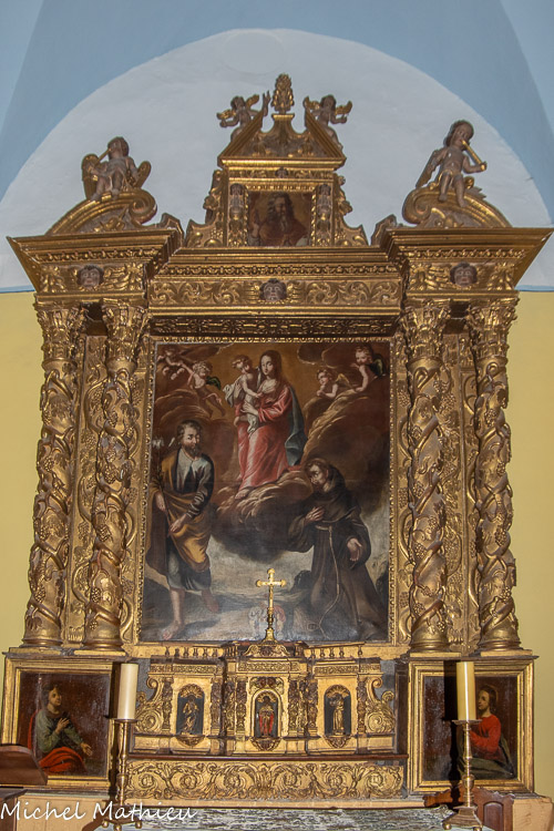Chapelle Saint Joseph. L'ensemble du maître-autel est un ensemble hétérogène, composé d'un autel indépendant surmonté d'un unique gradin, d'un tabernacle et d'un retable, sculptés, dorés et peints. Au centre du retable prend place un tableau d'autel peint à l'huile sur toile. Retable baroque de Lecler Angloie , de 1648 : "la Vierge , St Joseph et St François".