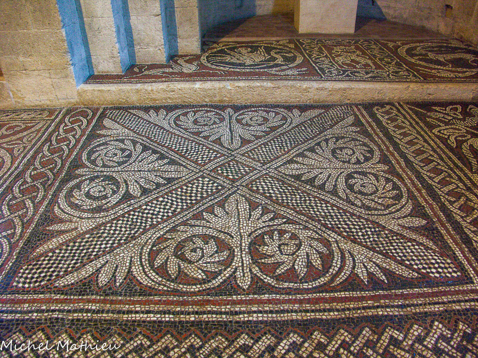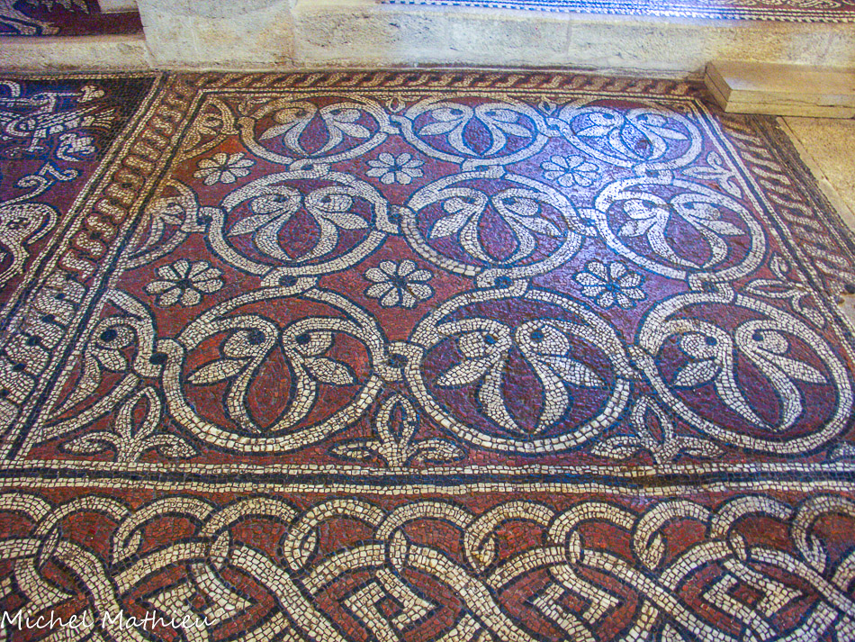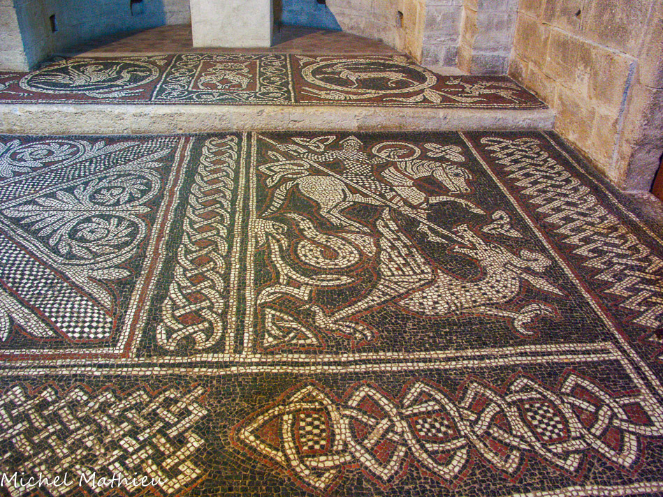 A gauche, un taureau à tête humain. Au fond, une lutte de monstres et de cavaliers. D’autres animaux fantastiques ornent le deuxième transept, dont certains marqués, comme sur les textiles sassanides, d’une croix pattée noire.