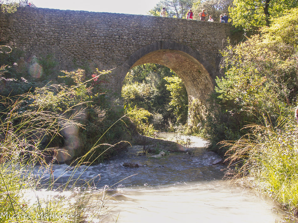 Pont romain sur le Buès. L'arche est en plein cintre. Elle est appareillée en double rouleau en partie inférieure puis continue en simple rouleau dans la partie centrale, cette partie étant issue d’une restauration. Les pierres des façades sont taillées en petit appareil régulier, dans du calcaire de Saint-Donat ; le tiers supérieur n’est pas antique, et utilise des pierres grossièrement taillées. À l'origine, le pont comportait un léger dos d'âne, et se prolongeait sur les deux rives avales par des rampes d'accès.