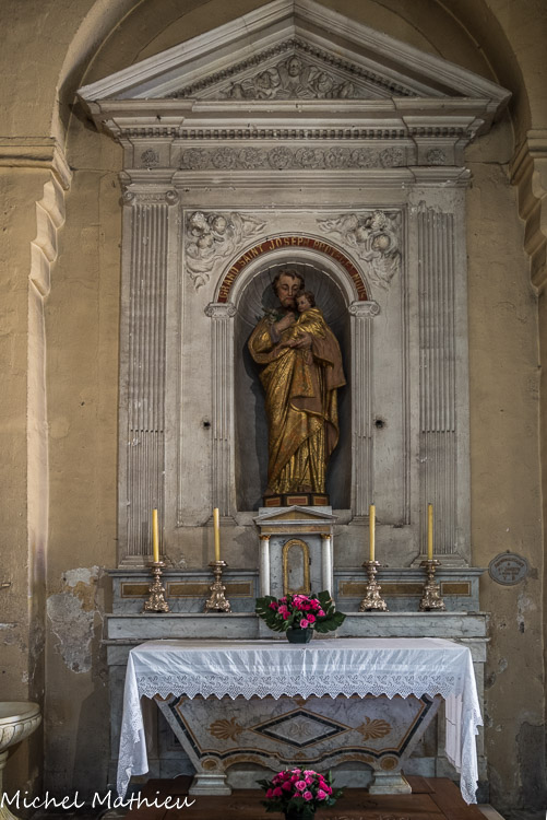 Reillanne Chapelle Saint Joseph. Anciennement autel de Notre-Dame du Rosaire, l'autel de Saint-Joseph se trouve à l'emplacement de l'absidiole dont on voit encore la partie supérieure de l'arcade pour créer la sacristie.