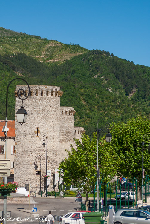 Face nord. Chemin de ronde (XIIIe s.) En 1692, Vauban, après l’invasion de la haute vallée de la Durance par le duc de Savoie Victor Amédée II (1675-1730), conçut pour Sisteron un vaste plan de défense intéressant la ville et la forteresse. De l’ambitieux projet, faute d’argent, seuls la poudrière (cachée à moitié par les arbres) et un puits (au nord) furent réalisés. Le petit bâtiment entre le donjon et la chapelle est la boulangerie du donjon (XVIIe s.)