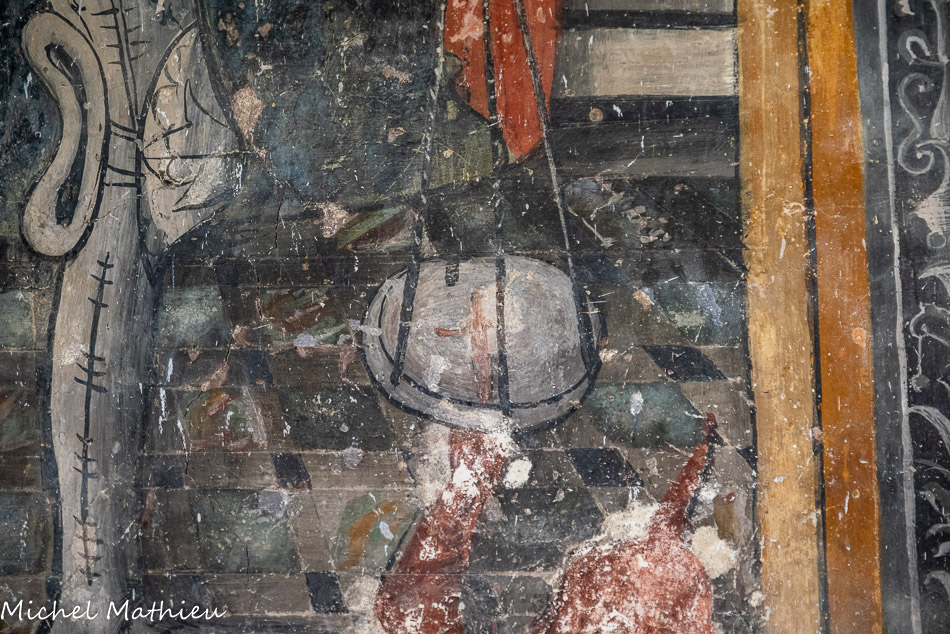 Cavalcade des 7 vices. La colère sur un sanglier et se poignardant, la goinfrerie sur un loup dévoreur avec un pigeon embroché, l'envie sur un chien et la paresse sur un âne qui aime le chardon dont ses piquants sont l'image des tentations qui passent par les rêves de la paresse.. De l'autre côté, les vertus ont été effacées par l'humidité et le temps.