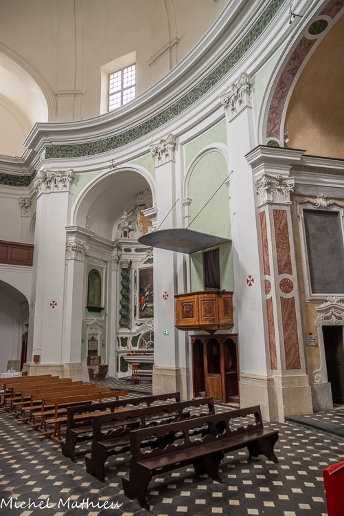 L’intérieur présente une architecture baroque impressionnante avec un plan en ellipse. Le dallage est en ardoise et cabochons de marbre, fréquent dans les anciens États Sardes. Les chapelles latérales sont ornées de colonnes torses dans des tons de vert.