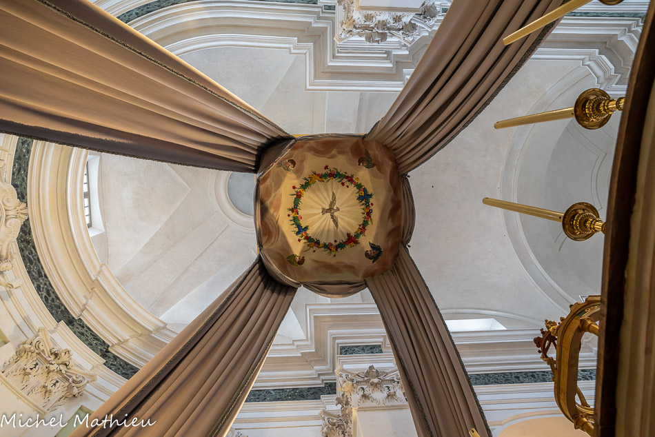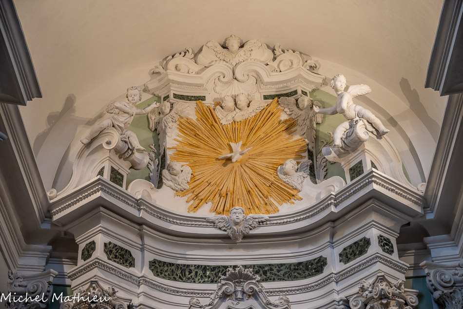 Au centre du médaillon frontal, le triangle trinitaire rayonnant vers le bas.