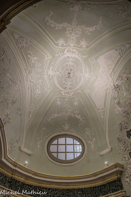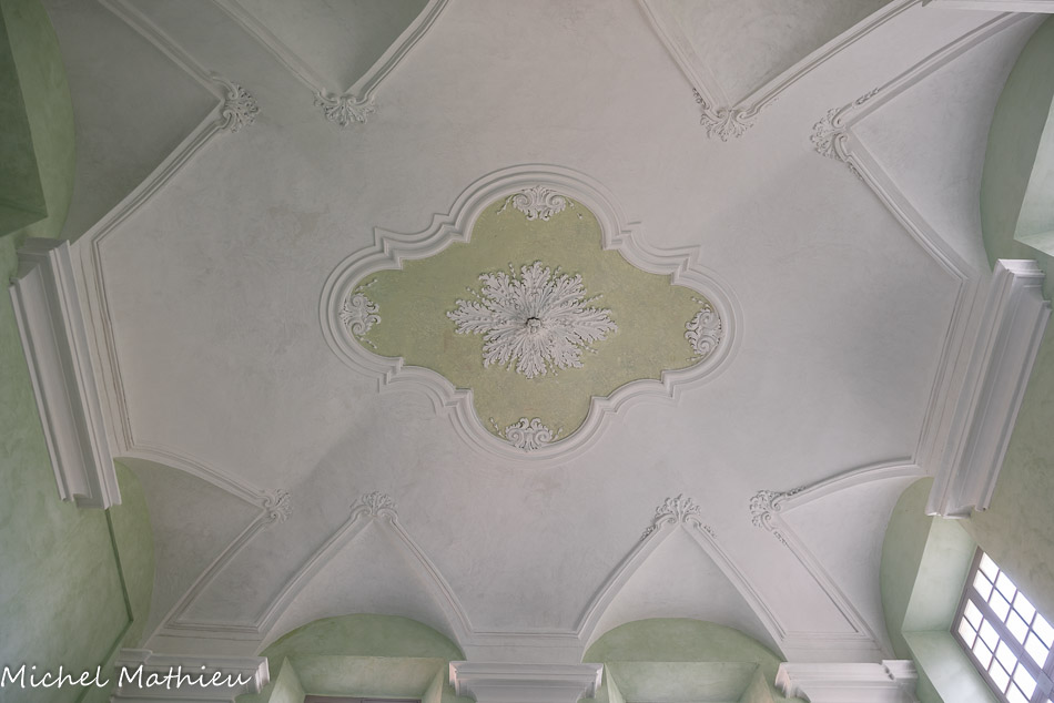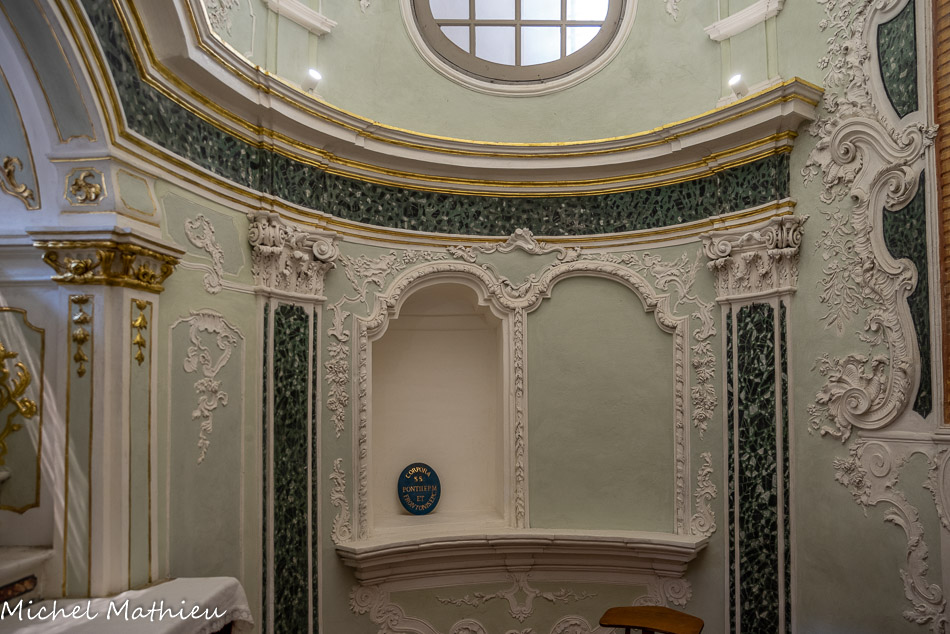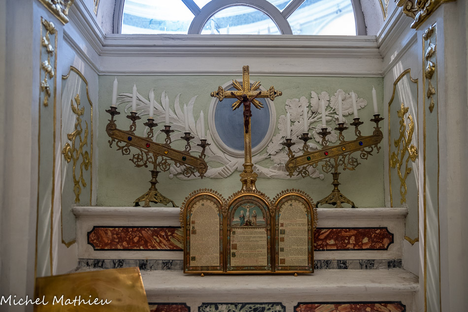 Chapelle des reliques. Gypserie. Ce petit oratoire renferme des murs peints en trompe-l’œil. Le décor a été repeint en 1843.