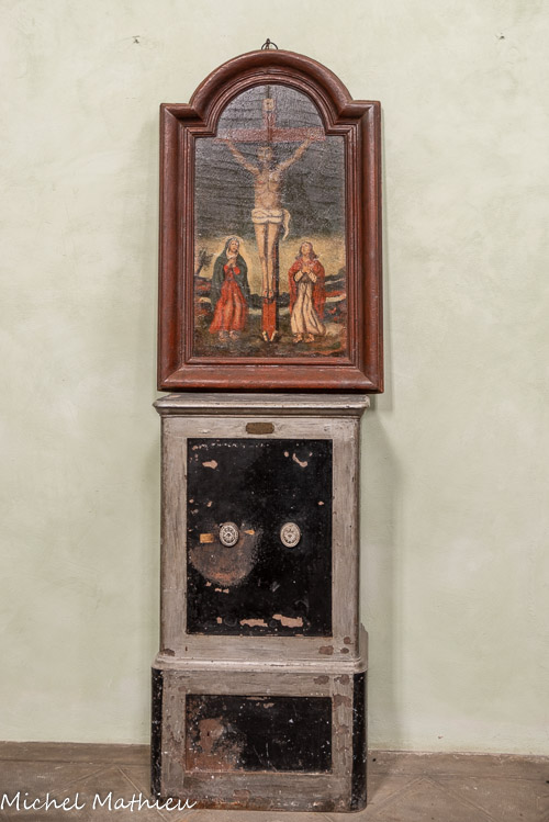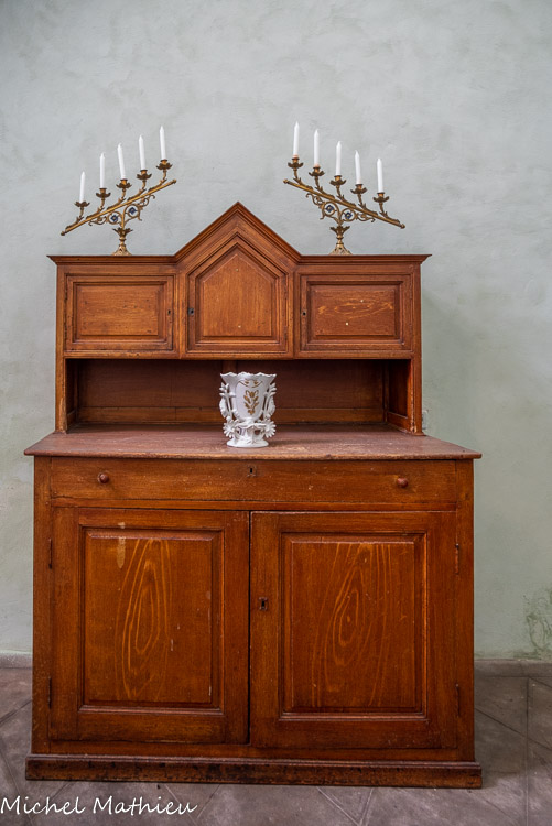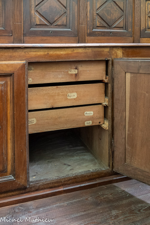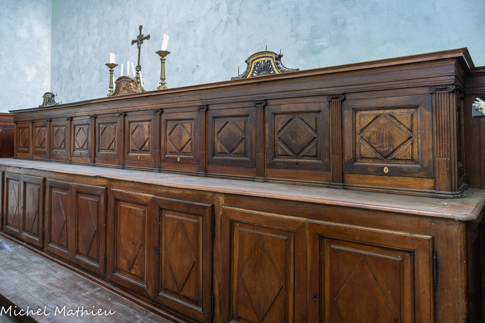 Meuble bas de sacristie à deux corps. Noyer. Le corps inférieur, plus large, contient les tiroirs à ornements fermés par des portes à deux battants (portes à panneaux rectangulaires moulurés avec un léger bossage losangique). Le corps supérieur contient des cases fermées chacune par un clapet. Composition architecturale plus soignée (cases séparées par des pilastres cannelés ioniques).