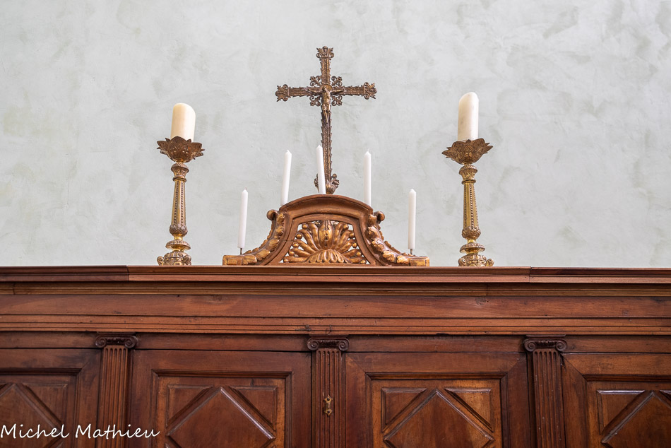Exposition : deux paires de colonnes supportent un dais ajouré surmonté d'une couronne royale. Croix d'autel : socle tripode, cylindrique surmonté d'une croix à embouts lyriformes décorés de feuillages stylisés. La statuette du Christ est entourée de quatre rayons à la croisée des bras.