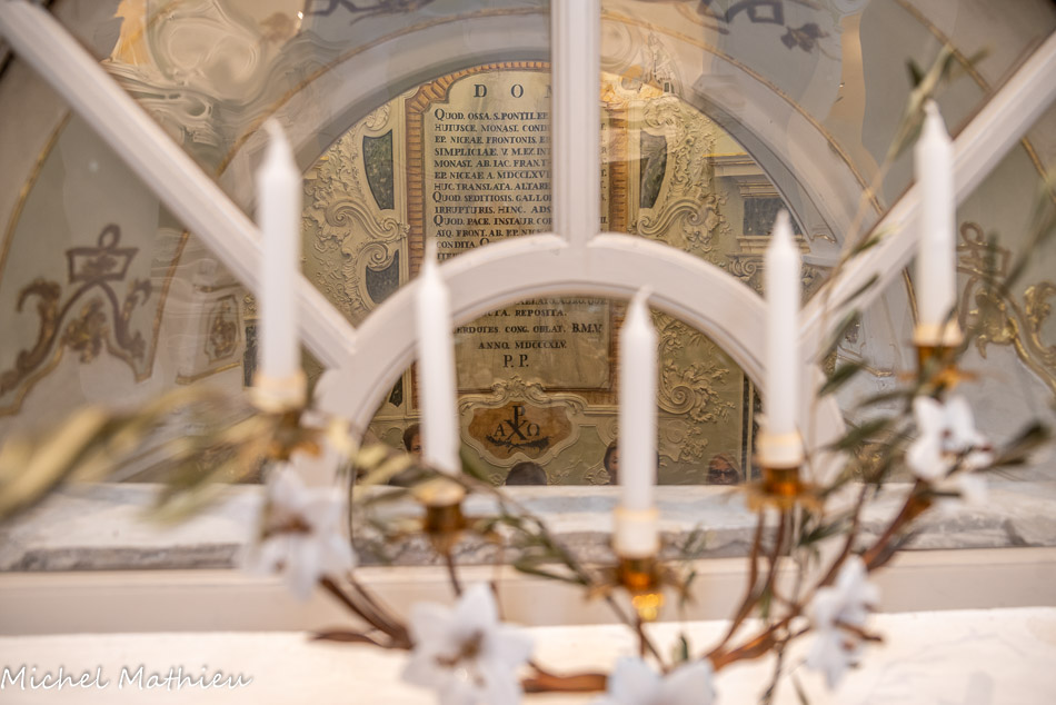 Chapelle des reliques. Pons (Pontius), de parents païens et de famille sénatoriale, naquit à Rome ; il étudia avec succès les belles lettres et la philosophie. Il se convertit après avoir entendu une psalmodie des matines, reçut le baptême des mains du pontife Pontien (+ 235) : il convertit ensuite son père et toute sa maison. Il distribua ses biens aux pauvres et voulut se consacrer à la prédication de l’Evangile. Il quitta Rome au moment où éclatait la persécution de Valérien et s’enfuit à Cimiez. Le président Claudius, envoyé pour exécuter les décrets de persécution, connaissait saint Pons : il le fit arrêter à Cimiez et voulut l’obliger à sacrifier aux dieux. Sur son refus, Pons fut suspendu au chevalet, exposé aux bêtes, placé sur un bûcher. Enfin sa tête tomba sous le tranchant du glaive. Pieusement ses amis et coreligionnaires recueillirent ses restes et les ensevelirent à l’endroit où se dresse aujourd’hui l’église, seul reste du monastère dont le nom devait perpétuer le souvenir du martyr.