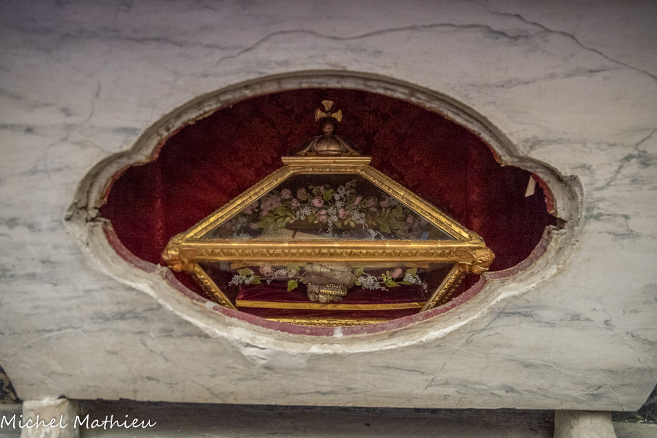 Chapelle des reliques. Cet autel -reliquaire aurait été réalisé vers 1843. Bois : taillé, peint , doré. Sur l'autel, trois canons d'autel. Les canons d'autel sont des tablettes qui sont dressées contre le tabernacle et le gradin de l'autel, pour aider la mémoire du prêtre dans la récitation de certaines prières de la messe.