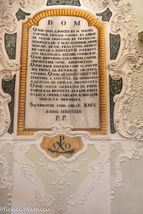 Chapelle des reliques. Face à l’autel, une magnifique sculpture en stuc représente le site de l’abbaye au centre. A gauche, le monastère de Cimiez, à droite, le portail d'entrée.